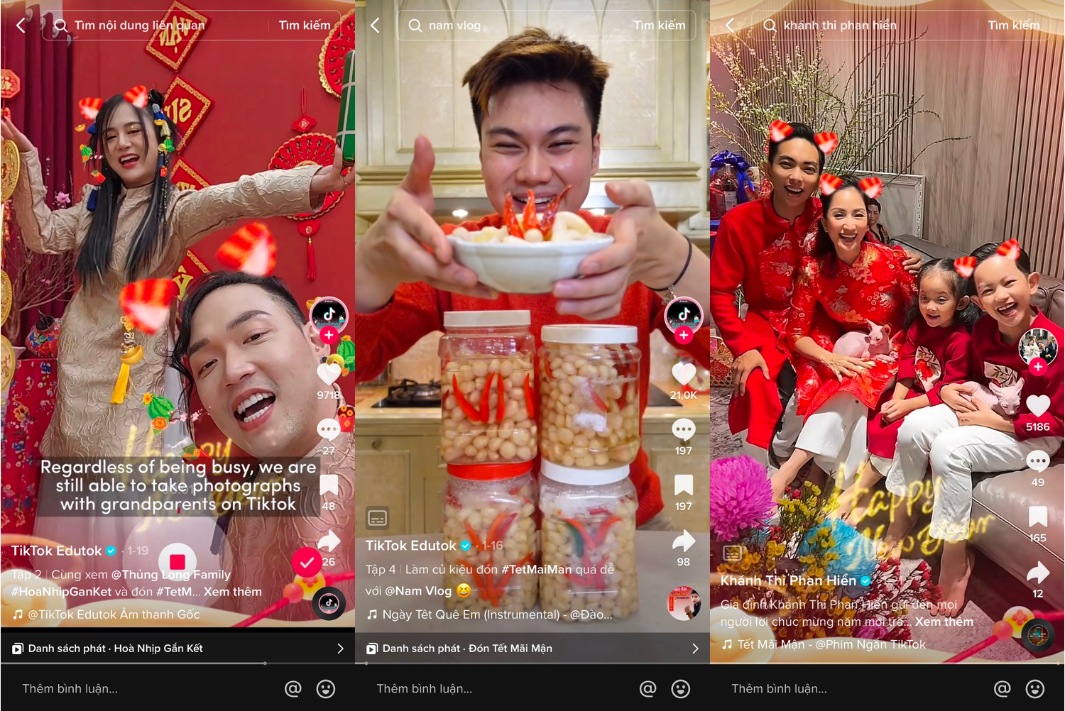 Với những người dùng khác, Tết truyền thống cũng được lưu giữ bằng những cách trẻ trung như: biến tấu các món “tuy lạ mà quen”, phối đồ chơi Tết, dọn dẹp và trang trí nhà cửa theo xu hướng, giới thiệu những địa điểm du lịch hay du xuân ít ai biết… Sự cởi mở của nền tảng đã mang đến không gian trao đổi rộng mở cho mọi đối tượng người dùng để hòa trộn các nét đẹp văn hoá đặc sắc.
