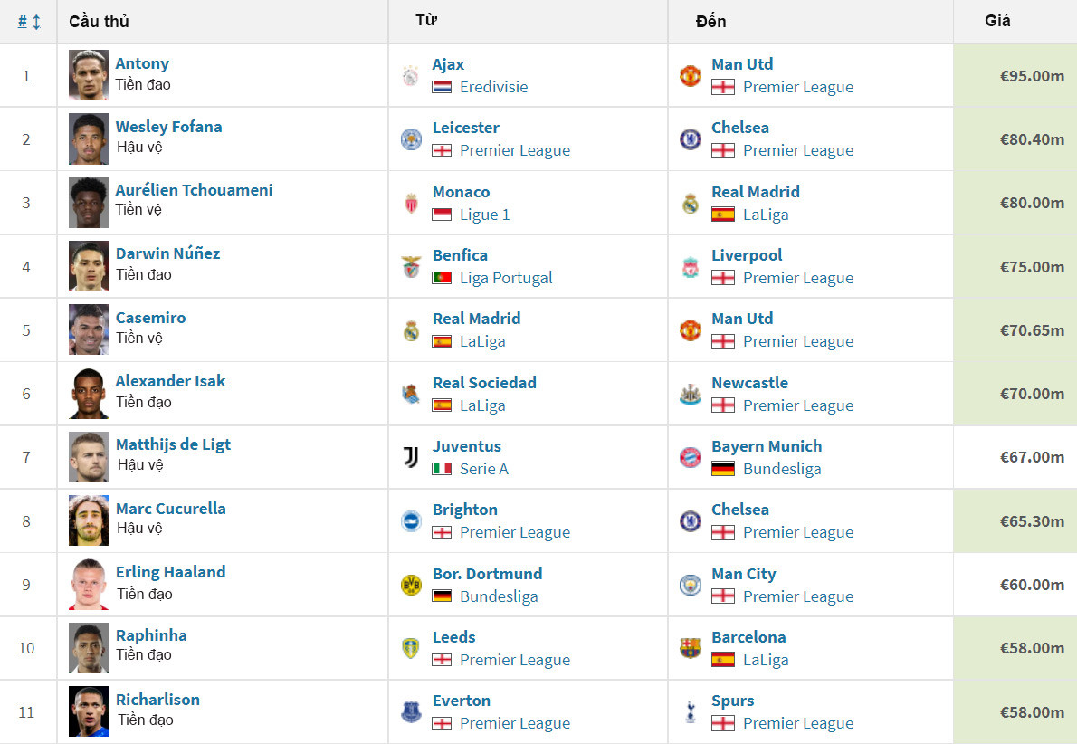Kỷ lục trong mùa hè thuộc về MU, khi chiêu mộ tiền đạo cánh Antony từ Ajax với giá 95 triệu euro. Sự ồn ào khác của "Quỷ đỏ" là hợp đồng với Casemiro (70,65 triệu euro trả ngay, 10 triệu euro trả sau).