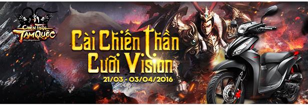 Chiến Thần Tam Quốc hiện đang diễn ra 2 chương trình hấp dẫn tại phòng máy là “Chơi Chiến Thần Tam Quốc – Nhận Galaxy S6 Edge” và “Cài Chiến Thần – Cưỡi Vision” với những phần quá hấp dẫn không kém, mọi người đừng bỏ lỡ!