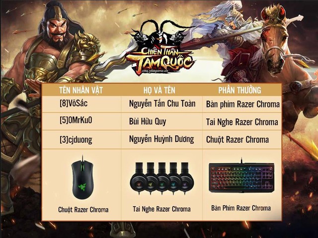 Bàn phím, tai nghe, chuột máy tính Razer đã thuộc về khách hàng may mắn là nhân vật VôSắc – S1, nhân vật 0MrKu0 – S5 và nhân vật cjduong – S3. Đây chắc hẳn là một điều khó quên trong một ngày đáng nhớ với 3 người chơi may mắn, ai lừa ai mặc ai, Chiến Thần Tam Quốc luôn luôn thật.