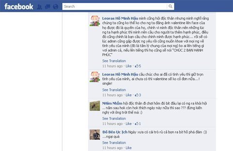 Với những chàng đã chia tay người yêu thì cũng không giấu được nỗi buồn. "Valentine buồn !!!!!!!! Mình có người yêu nhưng chia tay 2 năm rồi, đây là năm thứ 3 mình cô đơn...", vipa...tuan chia sẻ. Người mới chia tay thì cũng đầy tâm trạng khắc khoải, "mới chia tay ny tháng 11 năm trước. Tính đến giờ cũng 1 năm rồi nhỉ. Cũng mua quà rồi nhưng không tặng, mua theo thói quen thôi".