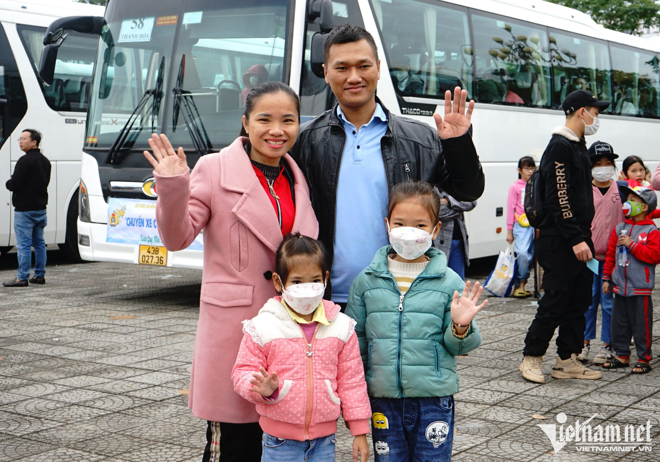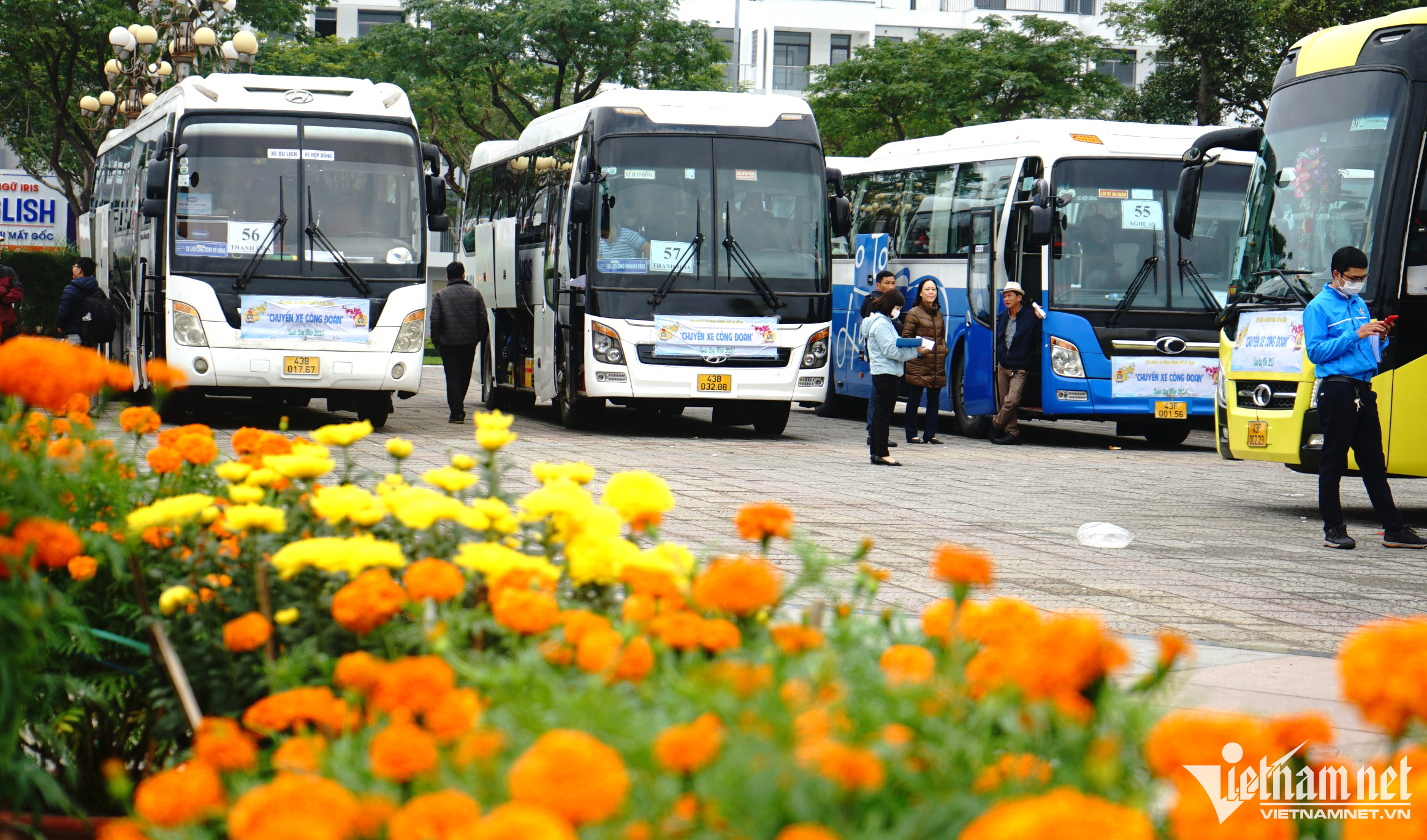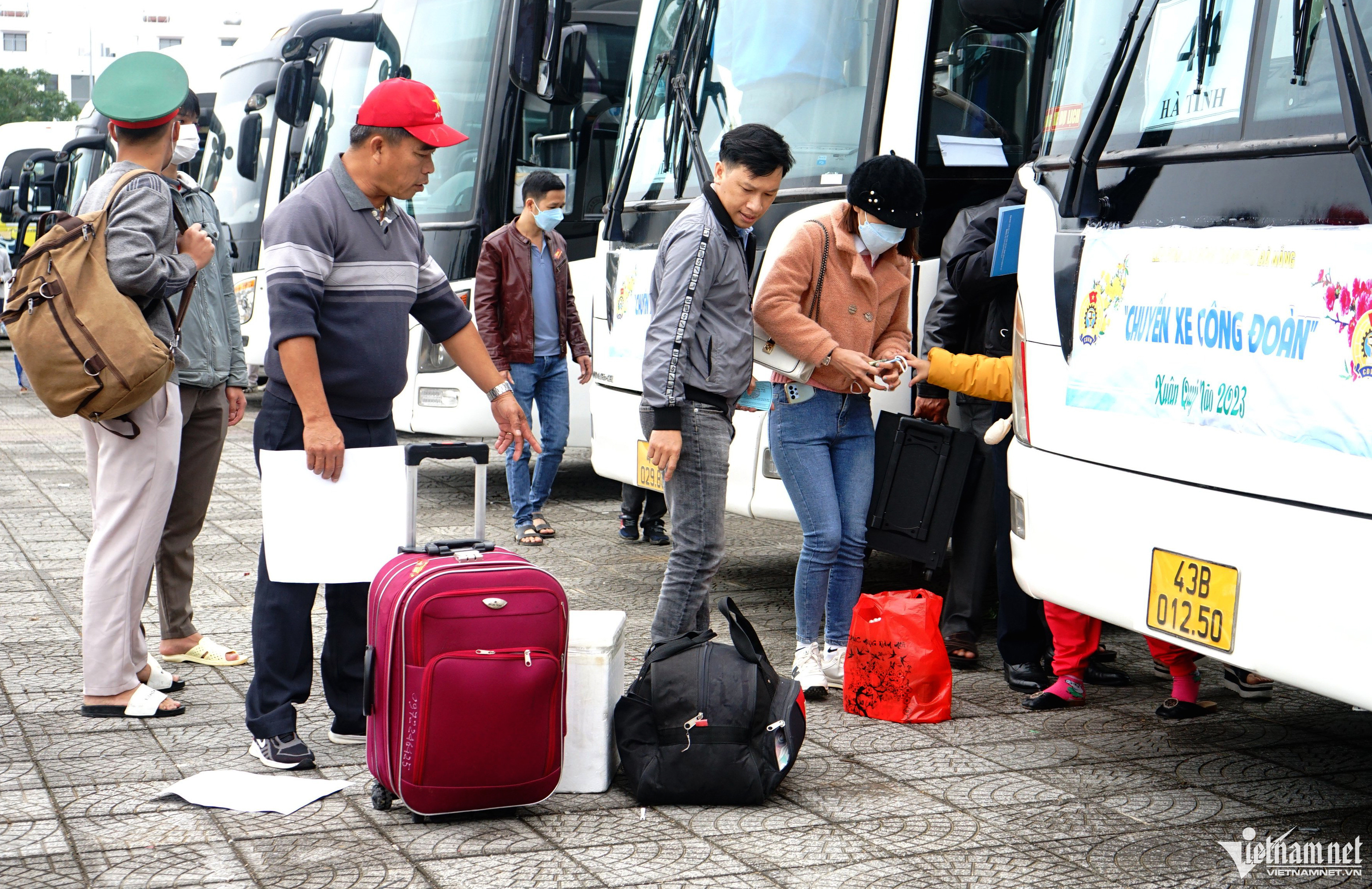 Ngày 19/1, Liên đoàn Lao động (LĐLĐ) thành phố Đà Nẵng tổ chức chương trình "Chuyến xe Công đoàn" đưa công nhân về quê ăn Tết Quý Mão 2023.Từ sáng sớm, hàng nghìn người lao động với hành lý lỉnh kỉnh, có mặt tại quảng trường quận Liên Chiểu để lên "chuyến xe 0 đồng" về quê.Đợt này, LĐLĐ thành phố Đà Nẵng triển khai 67 chuyến xe đưa gần 3.000 công nhân về quê, với lộ trình phía Bắc đến tỉnh Thanh Hóa, phía Nam đến tỉnh Bình Định và Tây Nguyên đến tỉnh Đắk Lắk. Nhiều em nhỏ theo cha mẹ về quê ăn Tết. Trước khi lên xe các bé được dán số hiệu chuyến xe để tránh bị lạc.Cùng chồng và 2 con nhỏ về quê ngoại ăn Tết, chị Hồ Thị Lê (làm việc tại công ty Yuri ABC) không giấu được sự xúc động. Chị quê ở Nghệ An, chồng chị quê Bình Định, anh chị kết duyên từ chương trình “lễ cưới tập thể” của LĐLĐ TP Đà Nẵng năm 2019. Từ đó đến nay, gia đình chị Lê đã 4 lần được về quê ăn Tết trên những "Chuyến xe Công đoàn", có năm về quê nội, năm về quê ngoại và những chuyến đi đó luôn để lại cho chị những kỷ niệm đáng nhớ.Niềm vui của các công nhân khi được về quê trên chuyến xe nghĩa tình.Chuyến xe lăn bánh đưa các công nhân về sum họp cùng gia đình sau một năm vất vả mưu sinh.