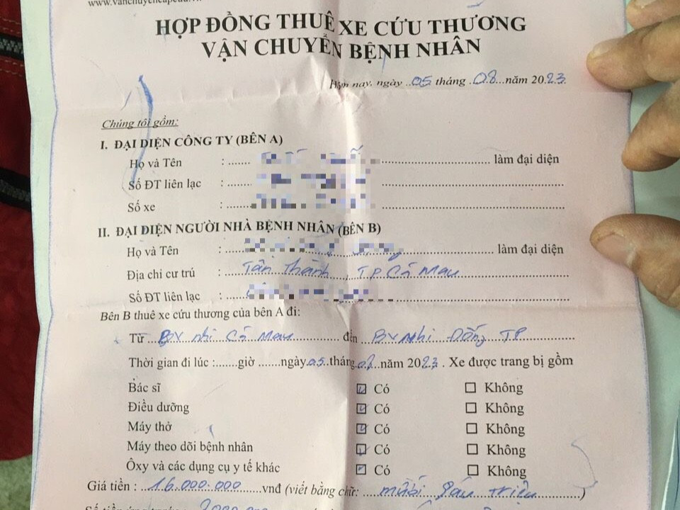 Hợp đồng thuê xe cứu thương có giá 16 triệu đồng, từ Cà Mau lên TP.HCM. Ảnh: BVCC.