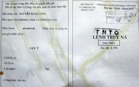 Lệnh truy nã đặc biệt tên Nguyễn Xuân Công sau khi y gây ra vụ giết người ở Gia Lai.
