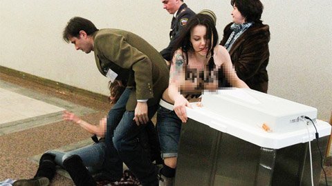 Theo các nhân chứng có mặt, nhóm phụ nữ này đã cố bê hòm phiếu trong đó có phiếu bầu mà ông Putin vừa bỏ vào đó.