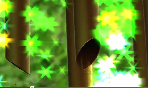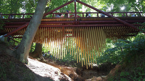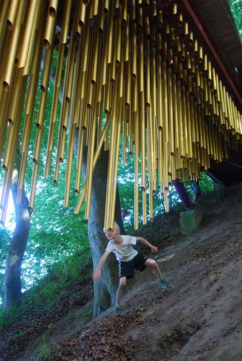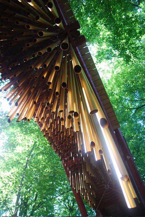Bên dưới cầu được gắn 1 dàn nhạc là các ống nhôm treo với các kích thước khác nhau.