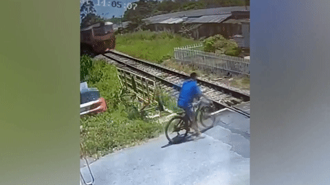 Vượt rào chắn đường sắt, xe đạp suýt bị tàu hoả 'nuốt chửng'