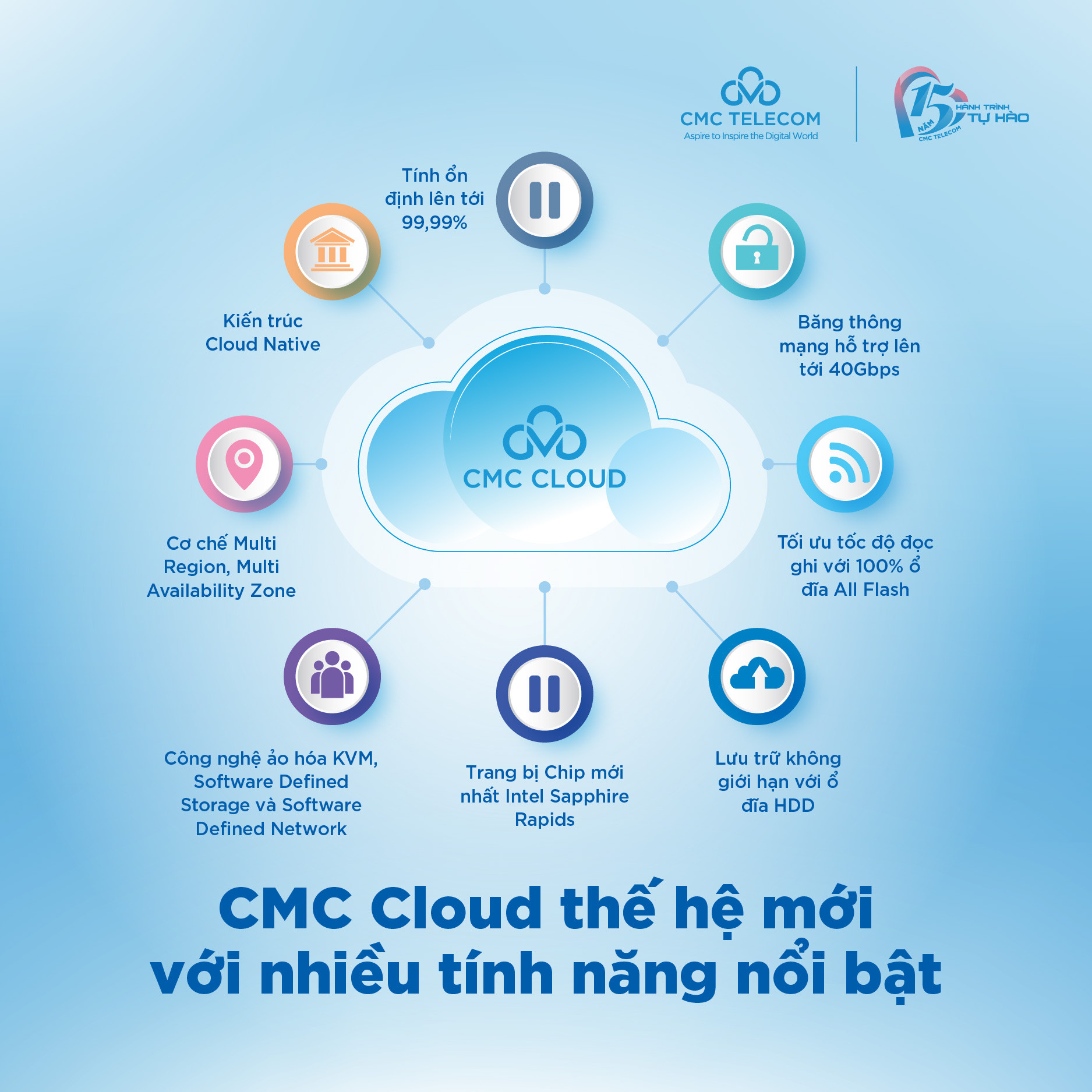CMC Cloud thế hệ mới có kiến trúc Cloud Native với công nghệ ảo hoá KVM, SDS (Software Defined Storage), SDN (Software Defined Network). CMC Cloud cũng được cân đối theo nhu cầu của khách hàng bằng việc xây dựng các gói tài nguyên phân sẵn, bao gồm: Small, Medium, Large, Xlarge. Trong đó, Chip Intel Sapphire Rapids hiện đại, hiệu năng mạnh mẽ nhất trên thị trường; năng lực lưu trữ không giới hạn với ổ đĩa HDD, tối ưu tốc độ đọc ghi với 100% ổ đĩa All Flash, băng thông mạng hỗ trợ lên đến 40Gbps, đều thuộc phân khúc cao nhất thị trường, đáp ứng mọi nhu cầu và đảm bảo hiệu suất hoạt động ổn định lên tới 99,99%.