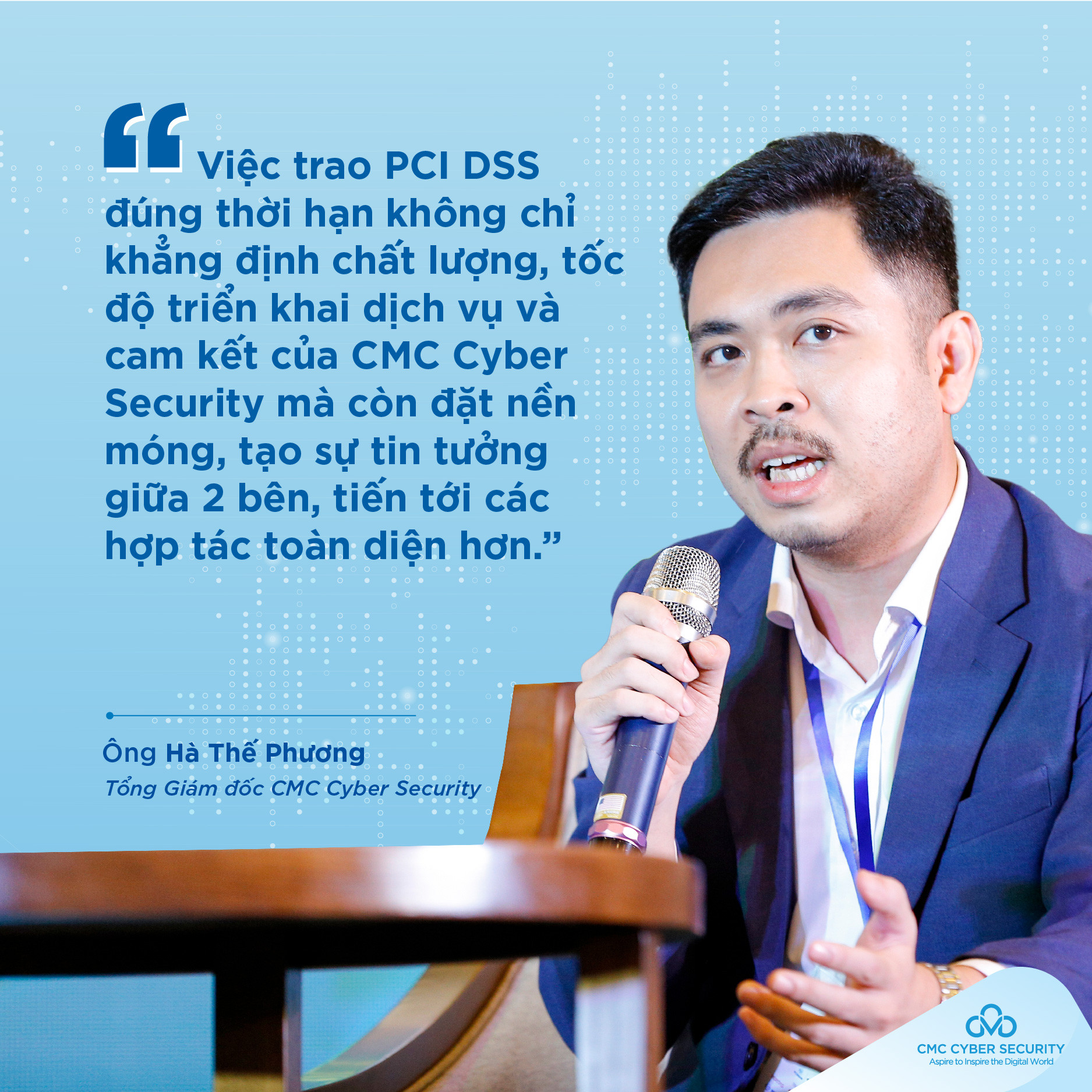 “Việc trao PCI DSS đúng thời hạn yêu cầu của phía khách hàng AppotaPay không chỉ khẳng định chất lượng, tốc độ triển khai dịch vụ tiêu chuẩn và cam kết với khách hàng của CMC Cyber Security mà còn đặt nền móng và tạo sự tin tưởng giữa 2 công ty, tiến tới các hợp tác toàn diện hơn về việc đảm bảo an ninh an toàn thông tin cho AppotaPay”, ông Hà Thế Phương - Tổng Giám đốc CMC Cyber Security nói.