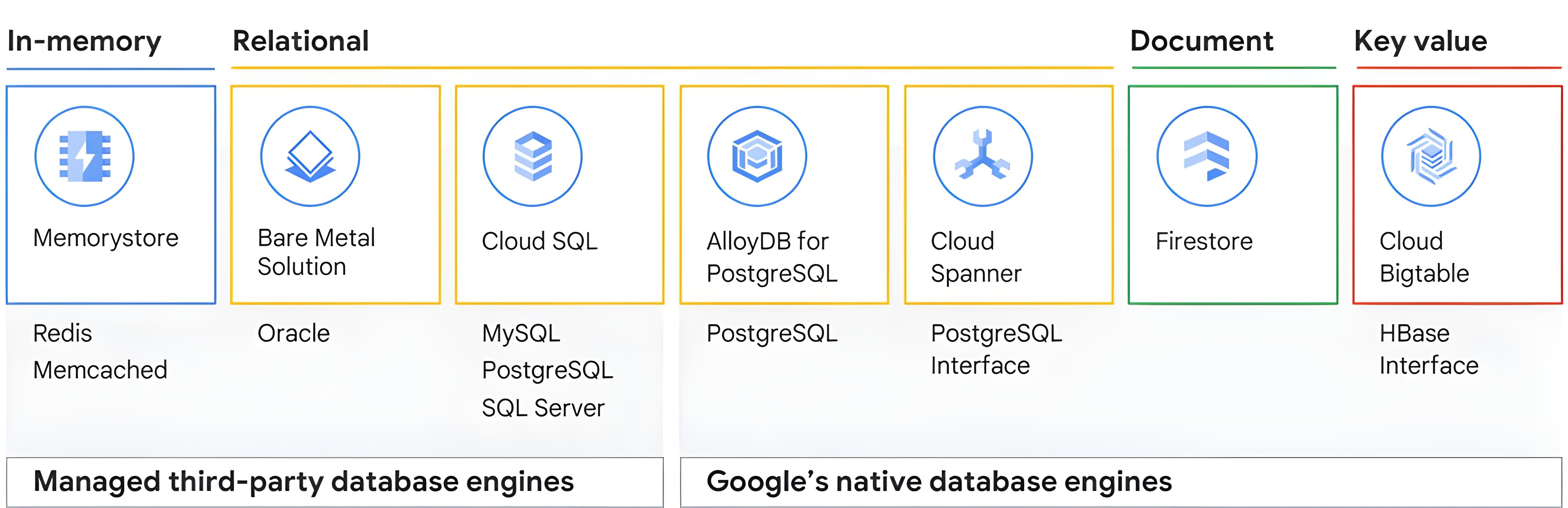 Cloud Spanner: Với khả năng mở rộng không giới hạn, tính nhất quán cao và độ sẵn có lên tới 99,999%, đây là lựa chọn phù hợp cho các ứng dụng gaming, sổ sách tài chính và quản lý chuỗi cung ứng/hàng tồn kho.