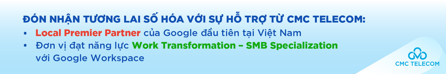 CMC Telecom là “Local Premier Partner” đầu tiên của Google tại Việt Nam và là đơn vị đạt năng lực Work Transformation với Google Workspace. Doanh nghiệp có thể nhận được sự hỗ trợ và cố vấn chuyên sâu từ đội ngũ giàu kinh nghiệm của CMC Telecom để tối đa hóa tiềm năng của các dịch vụ Google và đáp ứng hiệu quả nhu cầu cụ thể của mình.