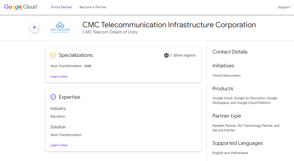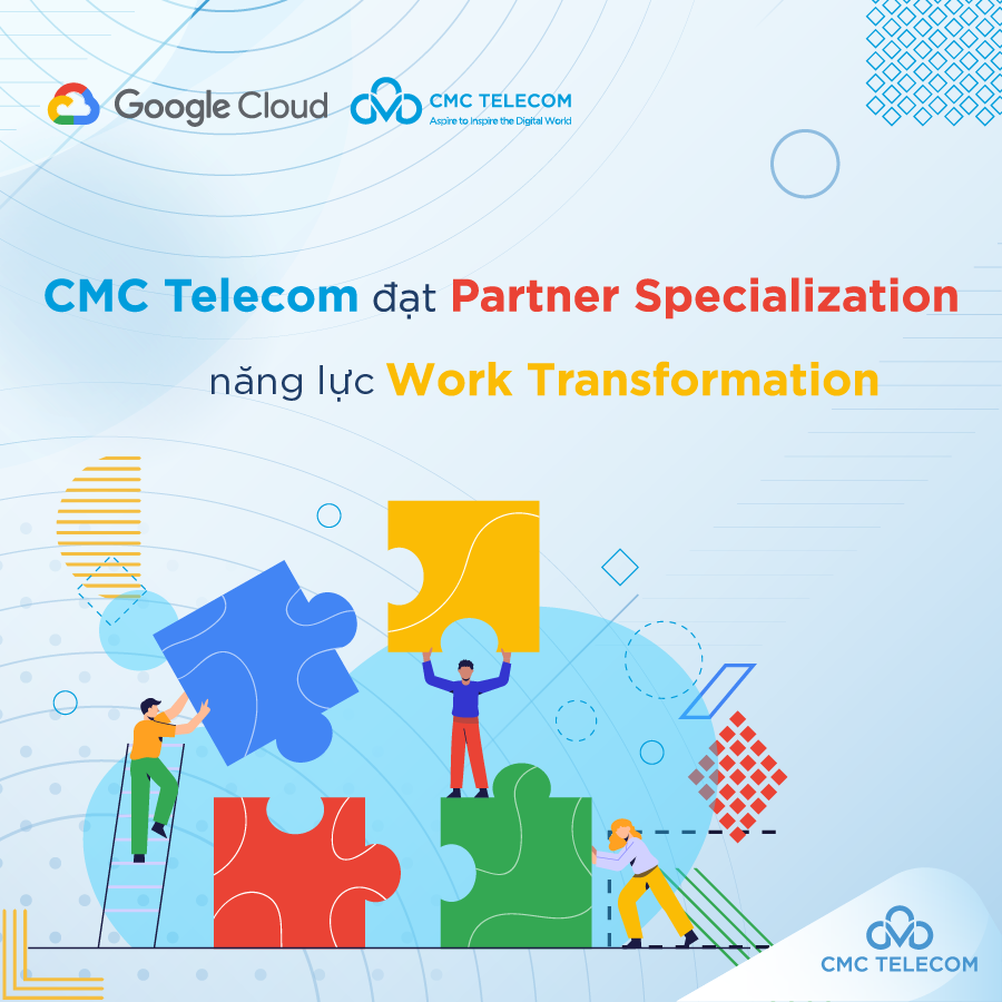 Với năng lực Work Transformation, CMC Telecom được Google công nhận là đối tác có khả năng chuyên môn cao hàng đầu trong việc tư vấn, xây dựng giải pháp và triển khai cho khách hàng khi chuyển đổi số với hệ sinh thái Google Workspace trên nền tảng Google Cloud Platform.
