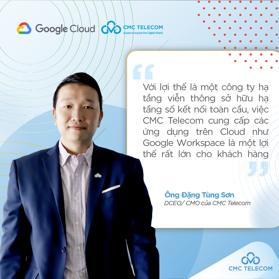 Ông Đặng Tùng Sơn, Phó Tổng Giám đốc CMC Telecom chia sẻ: “Với lợi thế là một công ty hạ tầng viễn thông sở hữu hạ tầng số kết nối toàn cầu, việc CMC Telecom cung cấp các ứng dụng trên Cloud như Google Workspace là một lợi thế lớn cho khách hàng”.