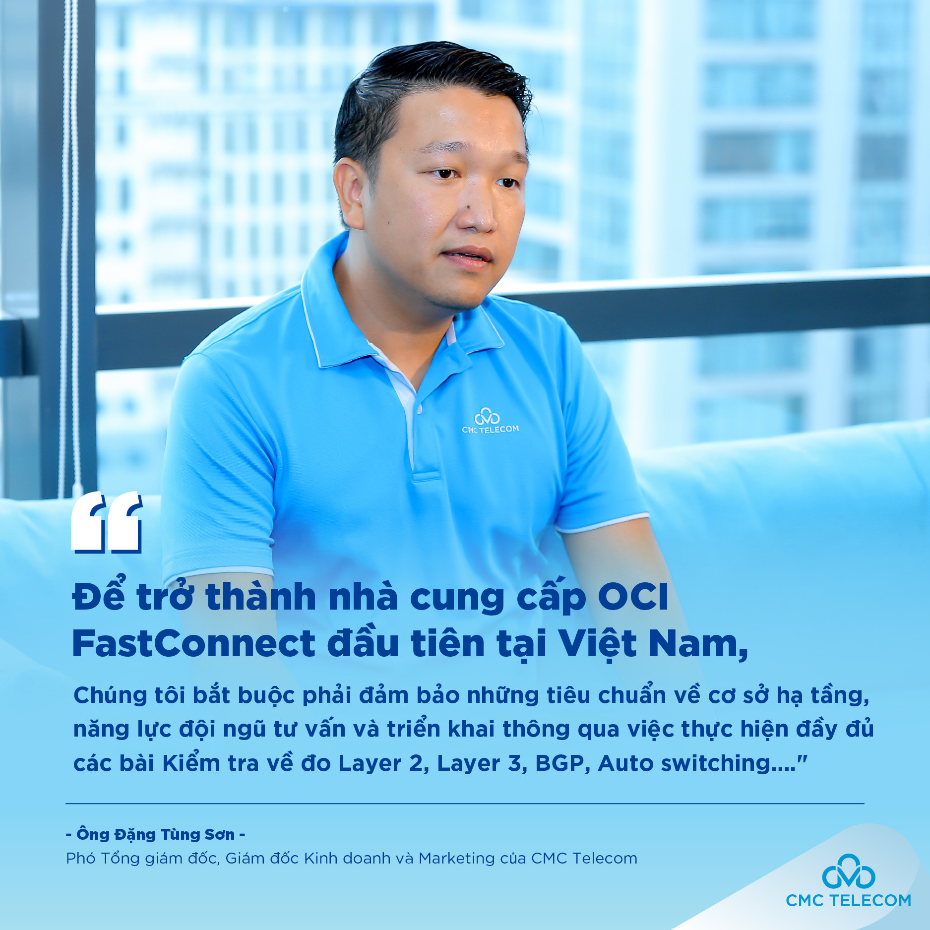 Ông Đặng Tùng Sơn - Phó Tổng Giám đốc, Giám đốc Kinh doanh và Marketing của CMC Telecom chia sẻ: “Để trở thành nhà cung cấp OCI FastConnect tiên phong tại Việt Nam, chúng tôi bắt buộc phải đảm bảo những tiêu chuẩn về cơ sở hạ tầng, năng lực đội ngũ tư vấn và triển khai thông qua việc thực hiện đầy đủ các bài Kiểm tra về đo Layer 2, Layer 3, BGP, Auto switching…. Tại đây, CMC Telecom muốn tối ưu tối đa nguồn lực của khách hàng với đường truyền kết nối chuyên biệt, không những nhanh mà còn có độ ổn định cao”.
