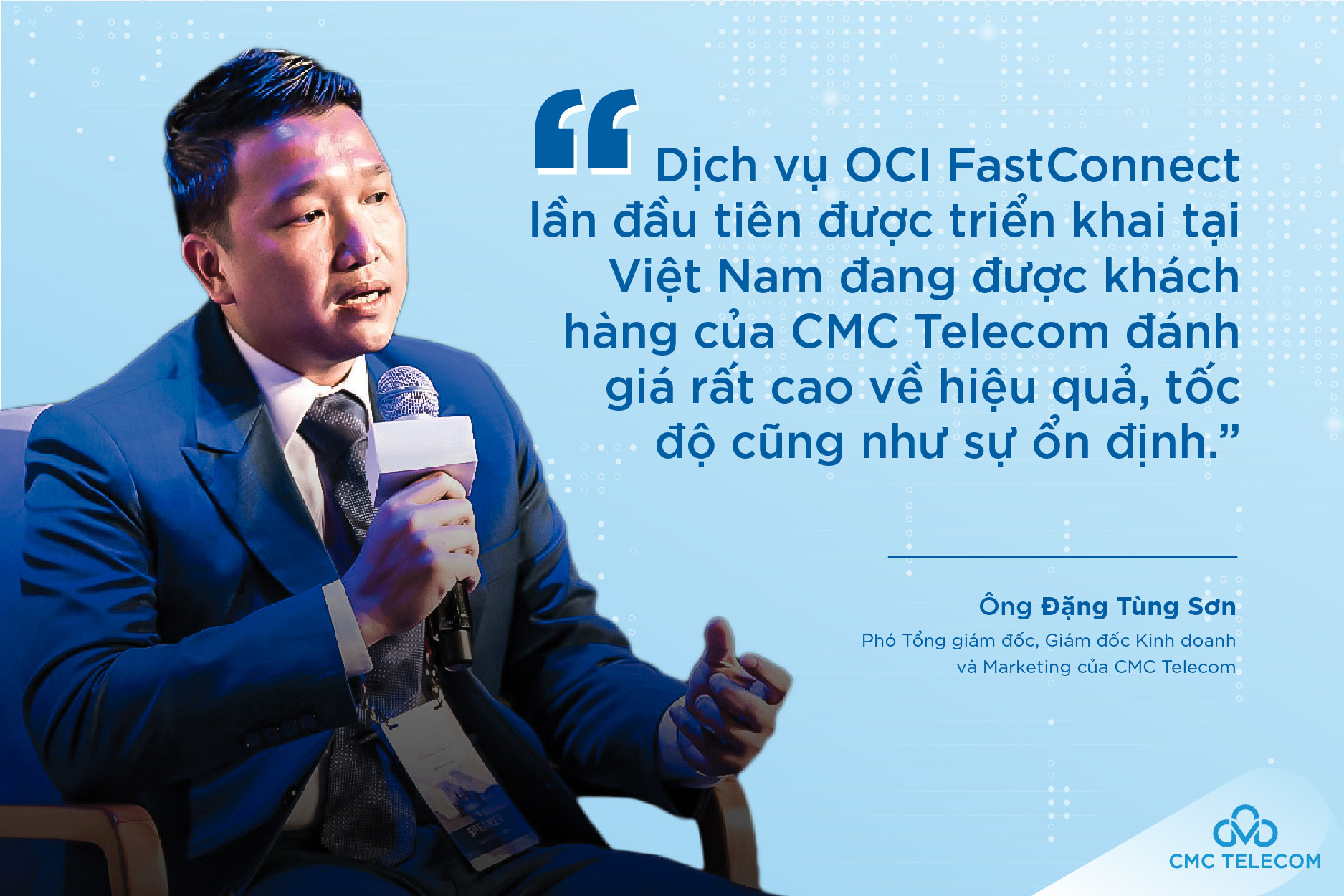 Ông Đặng Tùng Sơn - Phó Tổng giám đốc, Giám đốc Kinh doanh và Marketing của CMC Telecom cho biết: “Khi trở thành đối tác của Oracle, CMC Telecom không những khẳng định năng lực kỹ thuật đáp ứng tiêu chuẩn quốc tế mà còn chứng minh được bề dày kinh nghiệm khi đã triển khai kết nối thành công tới hạ tầng Equinix tại Singapore cho các ngân hàng, tổ chức tài chính và tập đoàn thông qua OCI FastConnect. Dịch vụ OCI FastConnect lần đầu tiên được triển khai tại Việt Nam đang được khách hàng của chúng tôi đánh giá rất cao về hiệu quả, tốc độ cũng như sự ổn định”.