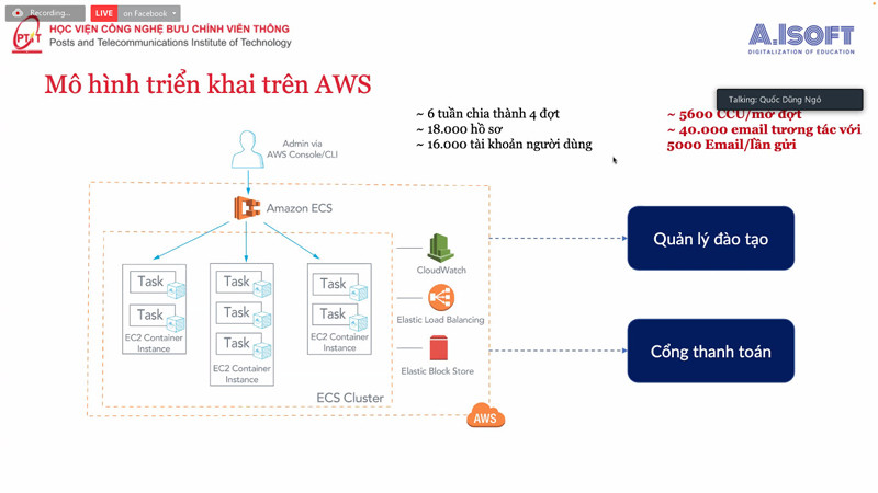 Theo đó, đội ngũ chuyên gia của CMC Telecom đã sử dụng tính năng “auto scaling” cho hệ thống “application” xử lý logic, qua đó nâng cao tính sẵn sàng, khả năng hỗ trợ lượng truy cập đồng thời hàng nghìn sinh viên mà vẫn đảm bảo trải nghiệm mượt mà, không bị gián đoạn. Hệ thống database sử dụng RDS với lịch “backup” đã được định sẵn ra Amazon S3, nhằm nâng cao tính ổn định và tránh mất mát dữ liệu trong trường hợp có sự cố xảy ra.