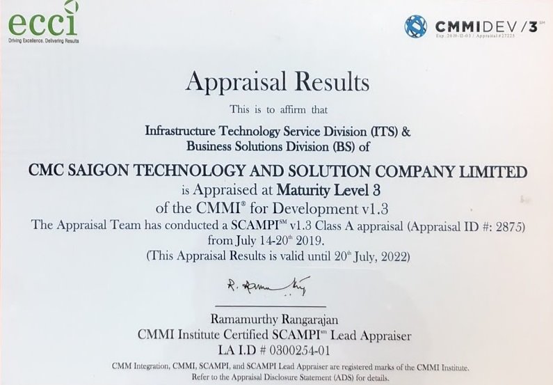 Sau hơn 1 năm nghiên cứu, thay đổi và áp dụng, Công ty TNHH Công nghệ và Giải pháp CMC Sài Gòn (CMC TSSG) vừa chính thức đạt được chứng chỉ quốc tế CMMI-DEV v1.3 (Staged): Maturity Level 3. Tính đến thời điểm hiện tại, chỉ có 25 doanh nghiệp trong hàng trăm doanh nghiệp CNTT tại Việt Nam đạt được chứng chỉ này. Tên của CMC TSSG đã được Viện CMMI được công bố chính thức trên website trong danh sách các công ty đạt chứng chỉ trên toàn cầu.