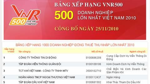 Trong bảng xếp hạng Top 1000 doanh nghiệp nộp thuế thu nhập lớn nhất 2010 mới được công bố (http://vietnamtop1000.vn/), hai doanh nghiệp viễn thông là MobiFone và Viettel đã bất ngờ giành vị trí cao nhất, vượt qua các “đại gia” truyền thống trong lĩnh vực tài chính ngân hàng, bất động sản và dầu khí.