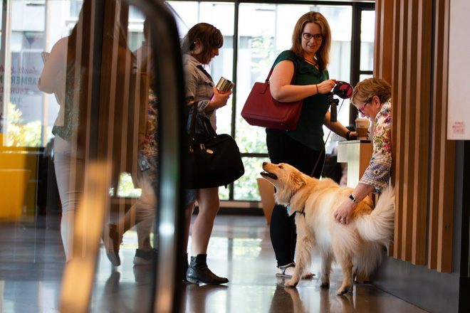 Nhân viên và chó của họ đi ăn trưa trong tòa nhà tại trụ sở Amazon ở Seattle.
