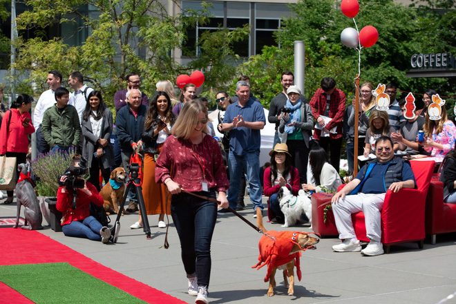 Richard Winograd, một kỹ sư phần mềm của Prime Video, làm việc cạnh chú chó giống Cockapoo của mình, đang nằm nép mình trong một cái giỏ. "Cậu bé này đủ nhỏ để tôi có thể mang theo mà không làm ảnh hưởng quá nhiều tới mình", Winograd nói. Vào giờ nghỉ, anh sẽ đưa "cậu nhóc" 7 tháng tuổi này đi dạo trong một công viên chó nằm trong khuôn viên Amazon, nơi mà những con chó được dạo chơi mà không cần đeo dây xích.