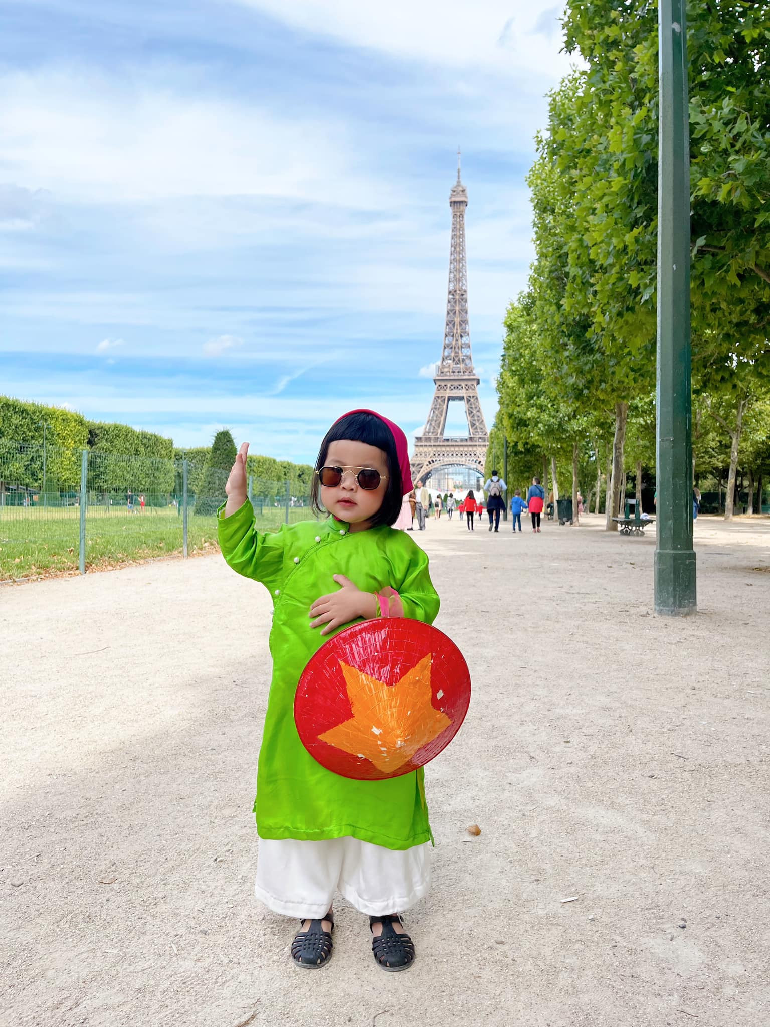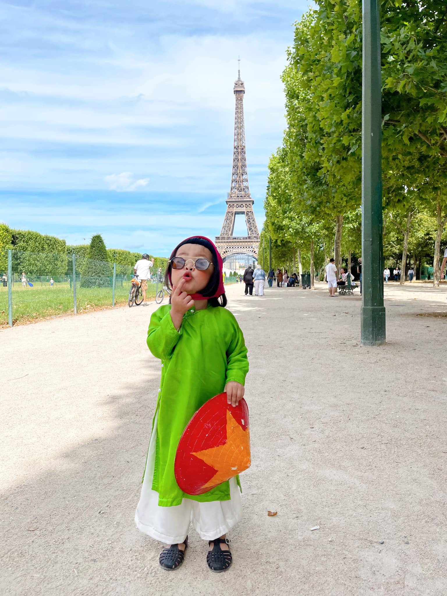 Cô bé diện áo dài, cầm nón lá chụp ảnh trước tháp Eiffel
