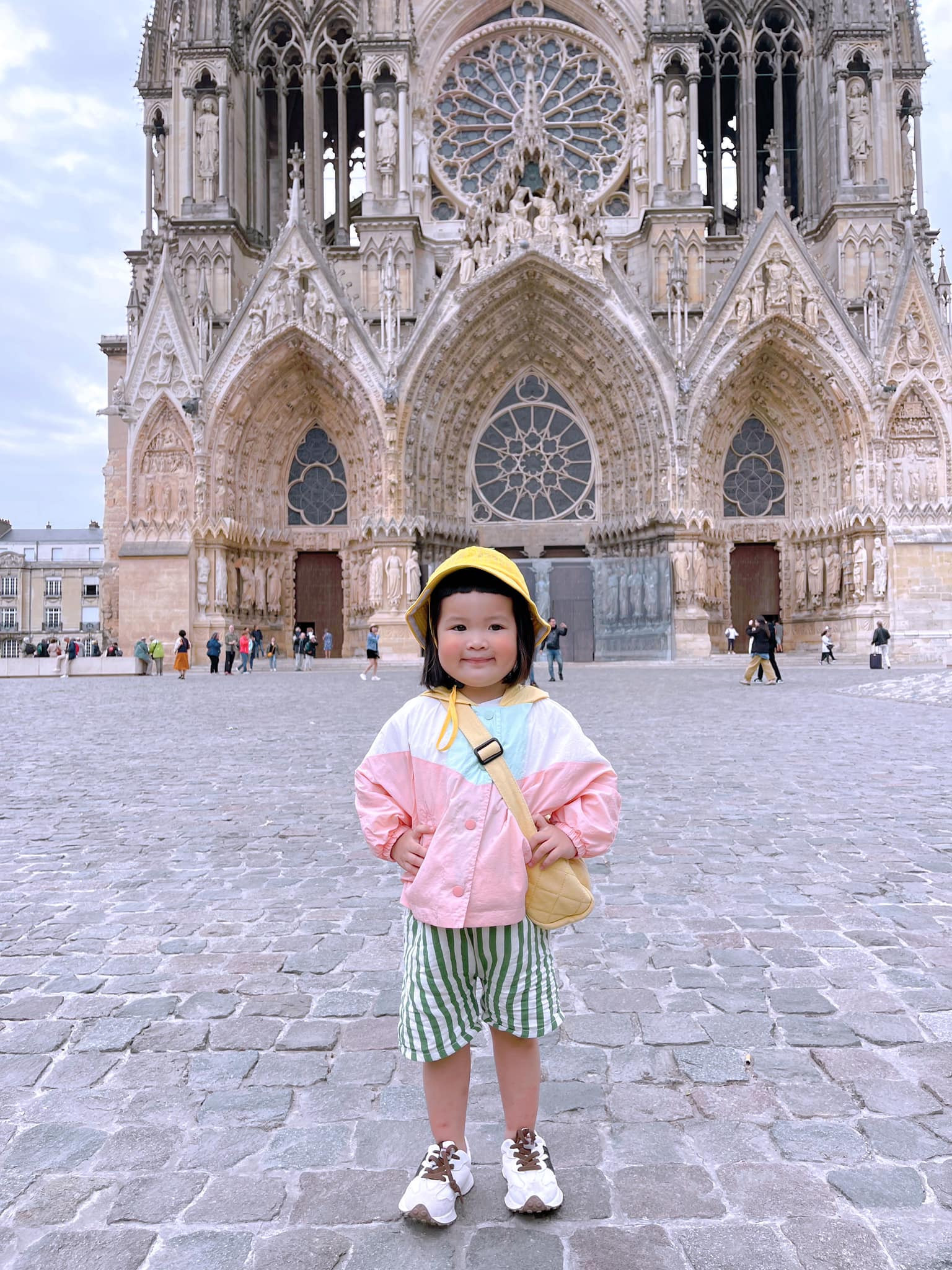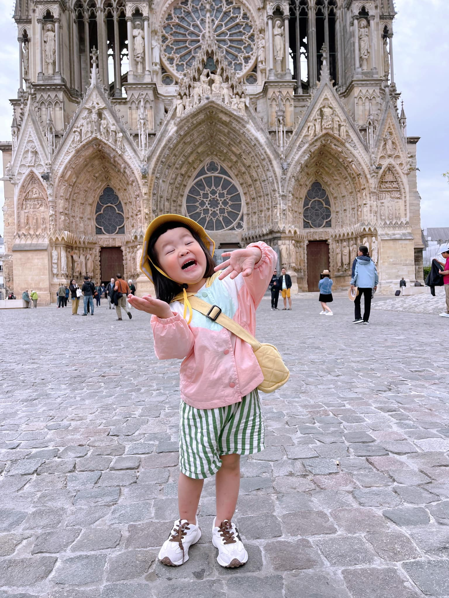 Bánh Bao với biểu cảm đáng yêu sau hành trình 162km di chuyển từ khách sạn tới Nhà thờ chính tòa Đức Bà Reims, Pháp