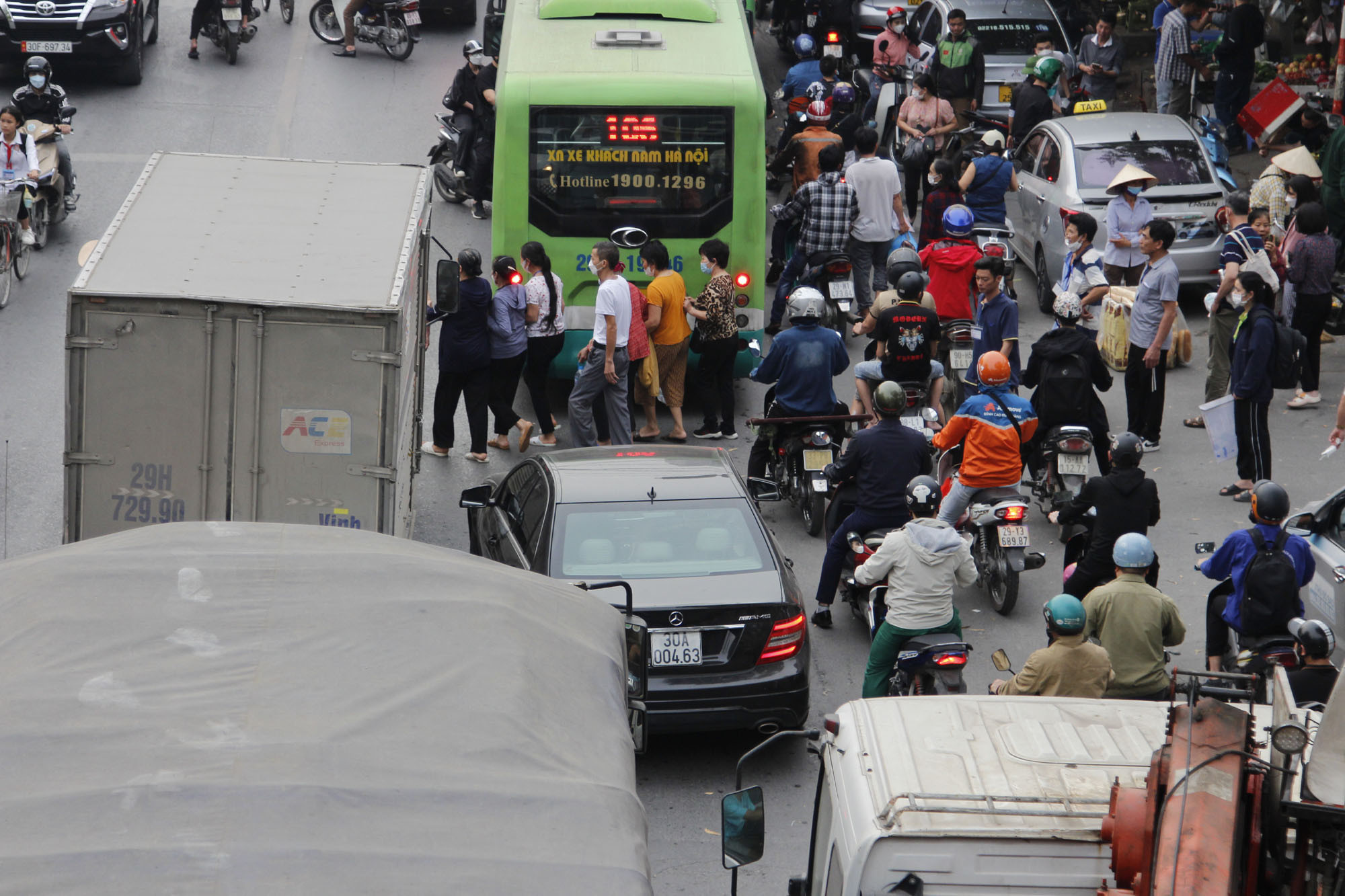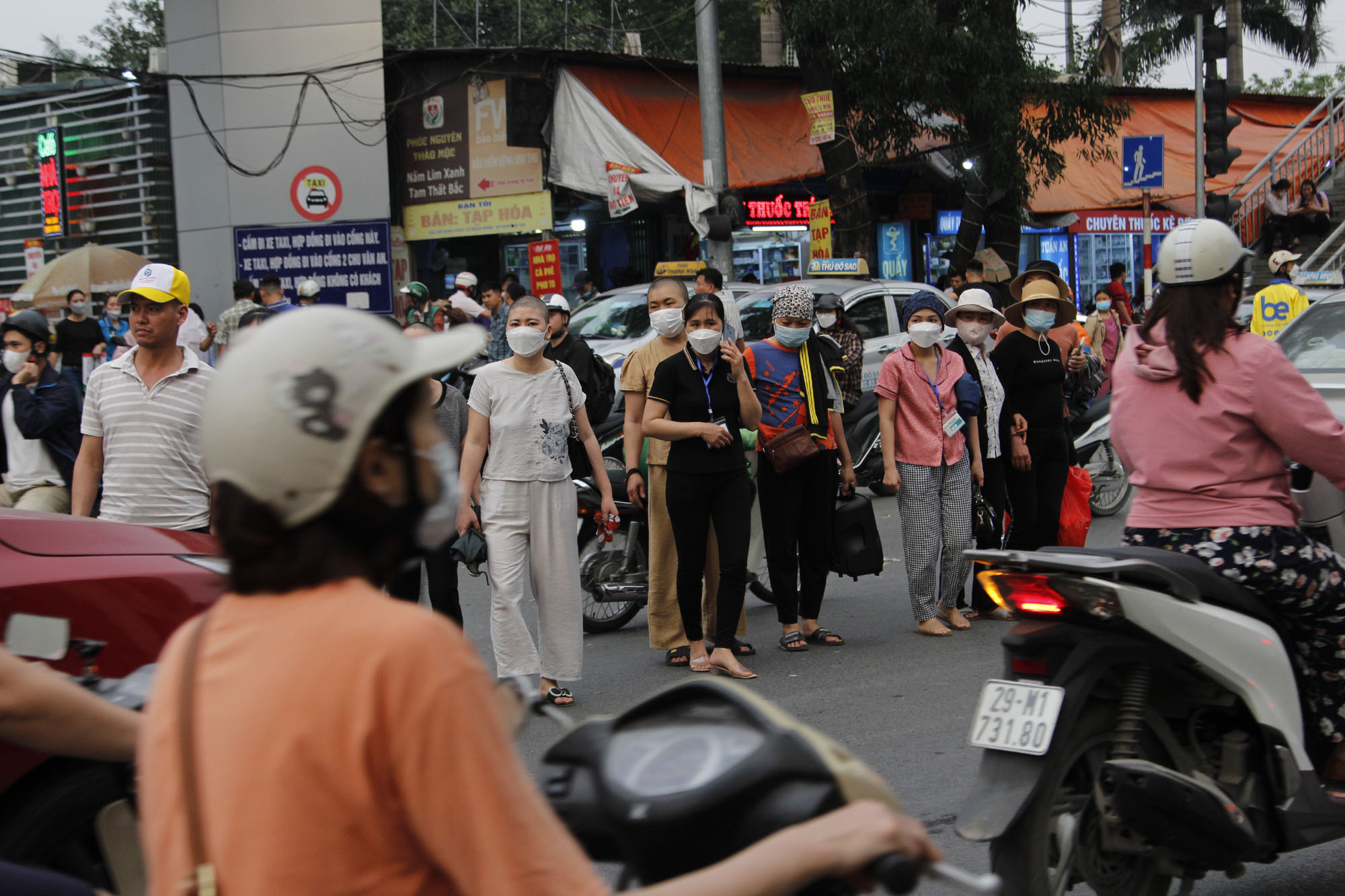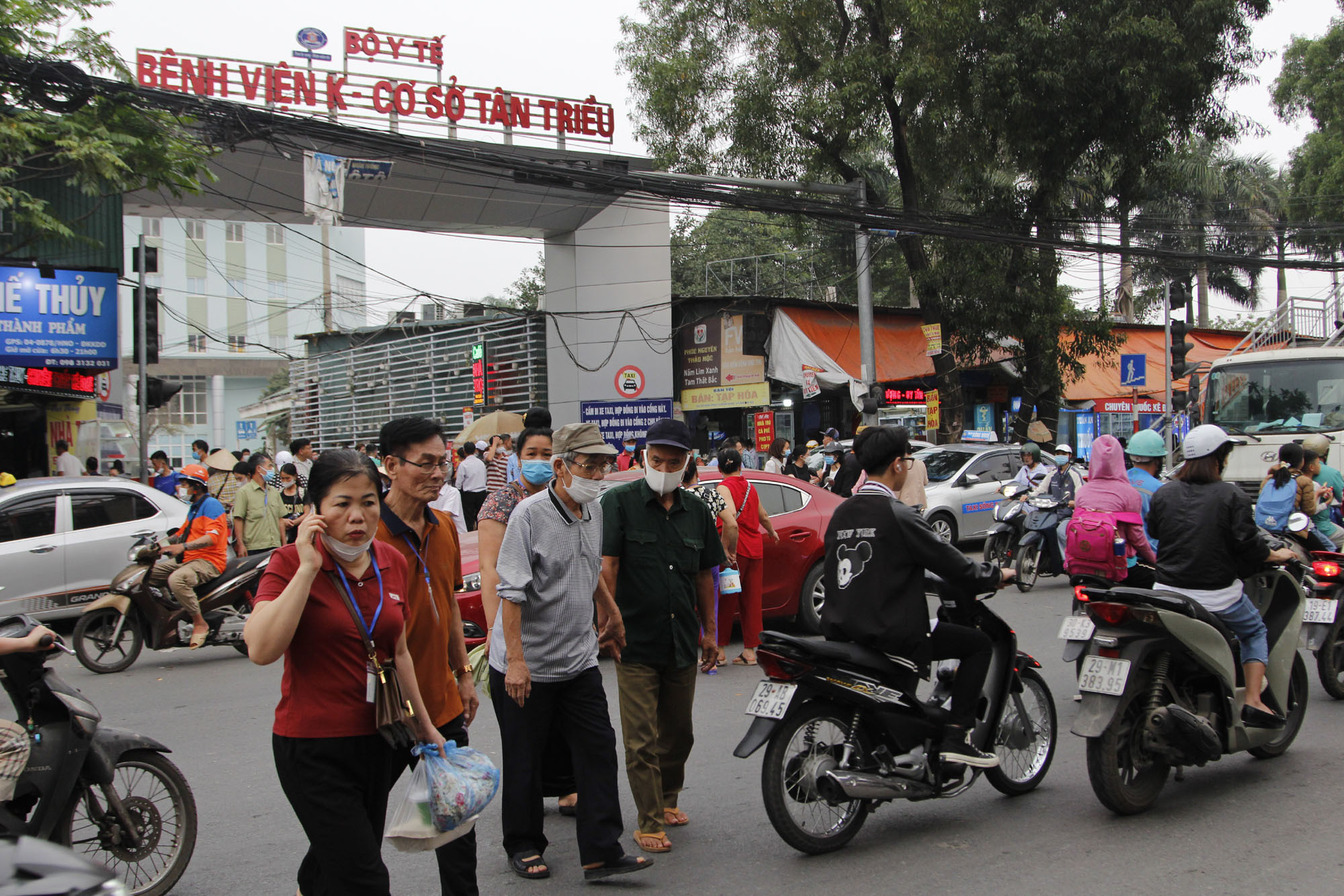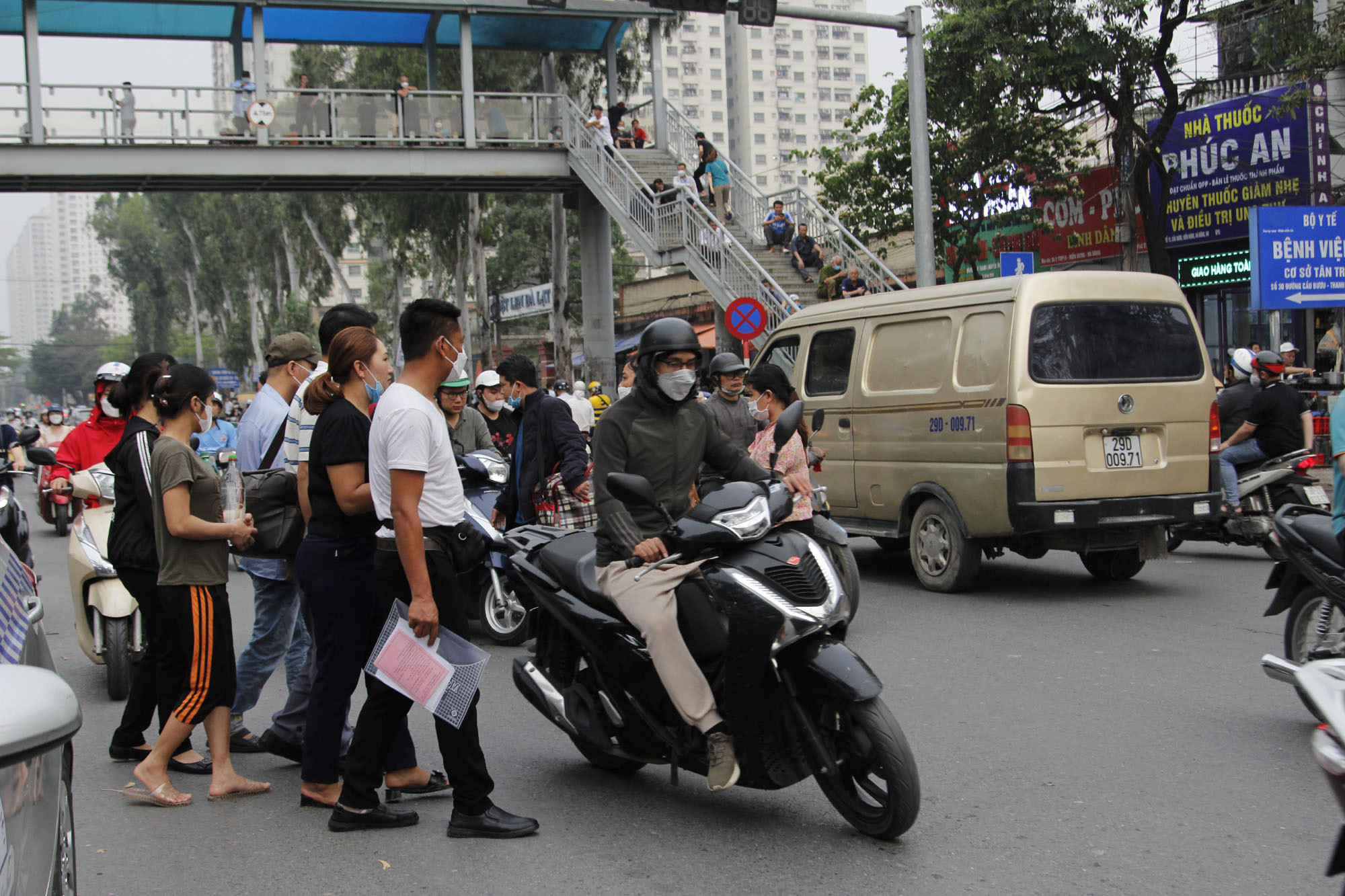 CSGT phải liên tục ra hiệu lệnh để cho nhiều người từ già trẻ và cả trẻ nhỏ băng qua đường Cầu Bươu trước cổng bệnh viện K.