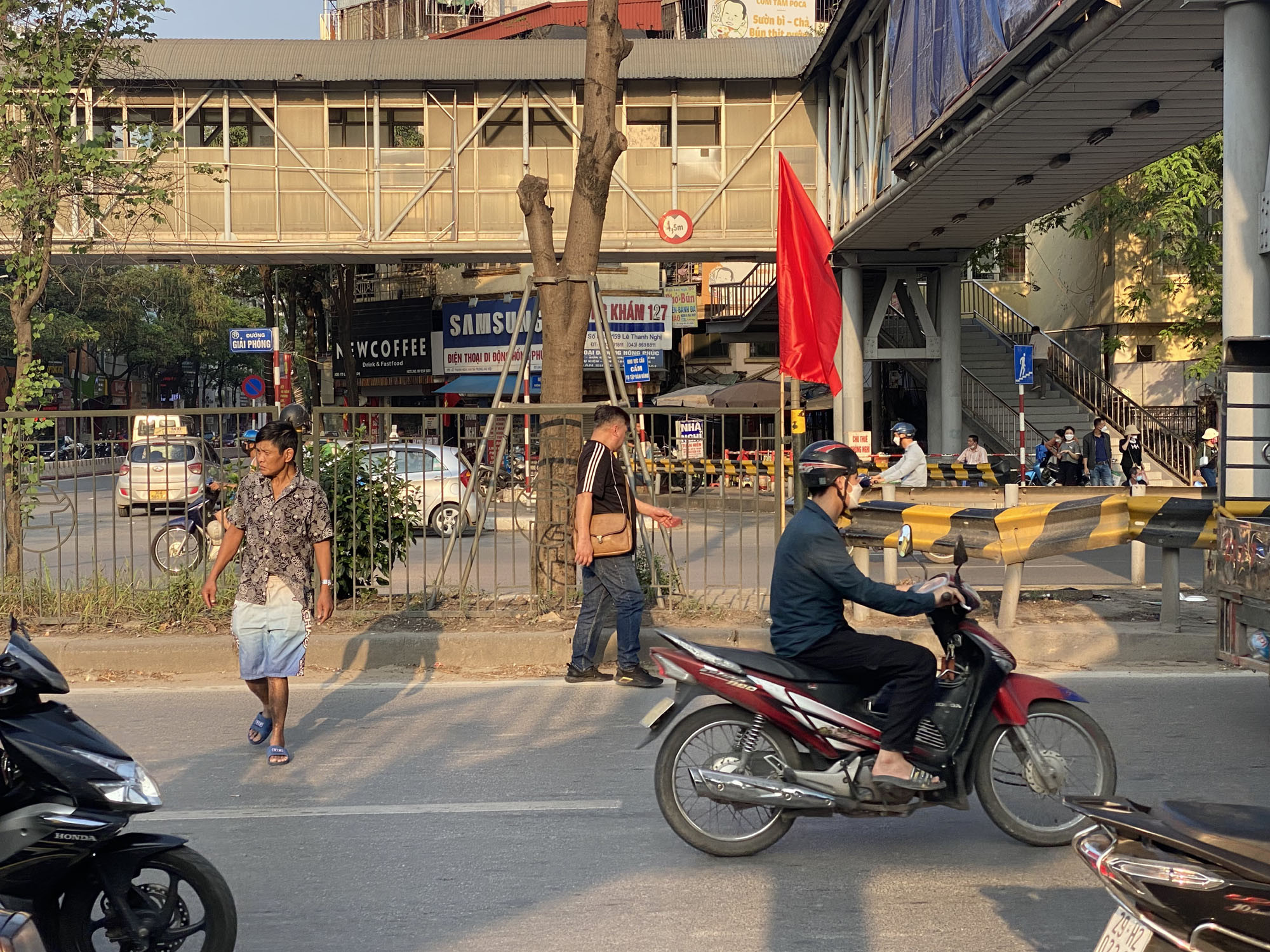 Tương tự, cầu bộ hành trên đường Giải Phóng còn xuất hiện tình trạng một số người dân bất chấp trèo qua hàng rào, dải phân cách để băng qua đường.