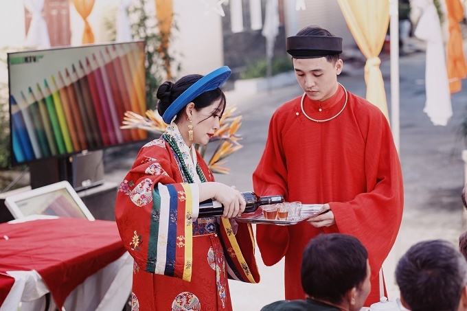 Cặp đôi Thùy Anh (SN 1993, Hà Nam) - Thành Nam (SN 1996, Cao Bằng) gây bất ngờ khi mặc áo Nhật Bình và áo tấc thay cho váy cưới và Âu phục trong ngày trọng đại. |