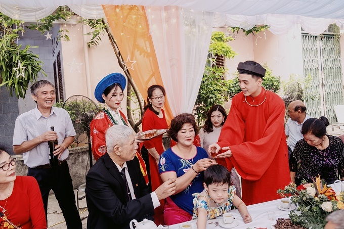 Nhiếp ảnh gia 9X cho biết thêm, ban đầu anh không biết đây là trang phục cổ nên không chuẩn bị ý tưởng gì. Sau khi tham khảo cô dâu, anh mới biết, đây là áo tấc và Nhật Bình. Quá trình diễn ra hôn lễ, anh cố gắng ghi lại khoảnh khắp đẹp và tự nhiên nhất cho cô dâu, chú rể. Đồng thời, lột tả được vẻ đẹp của trang phục. |