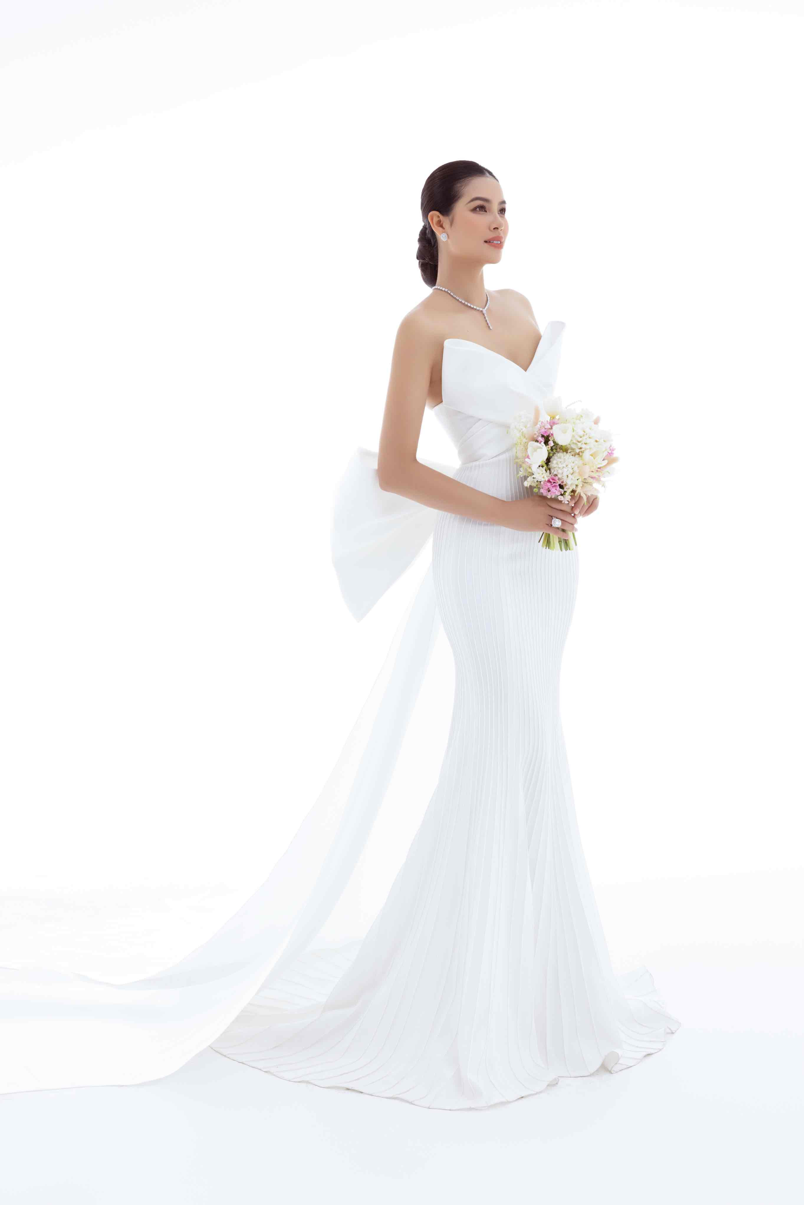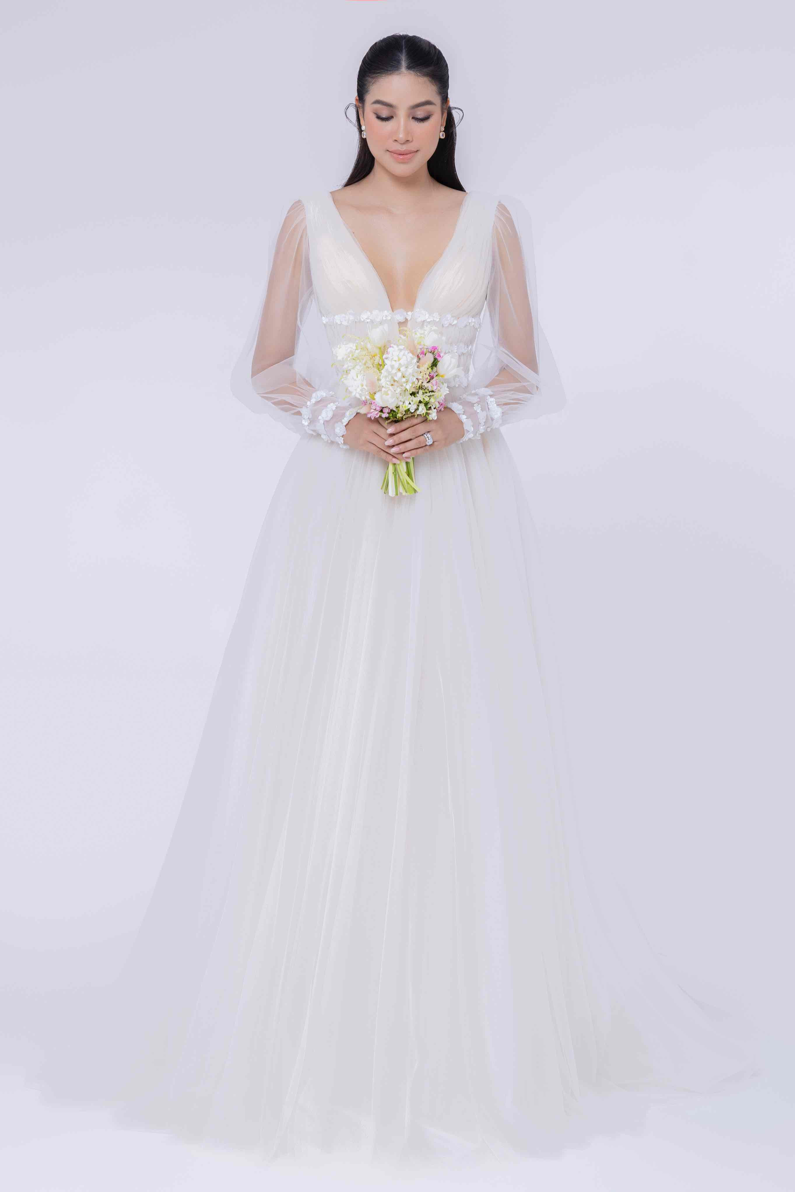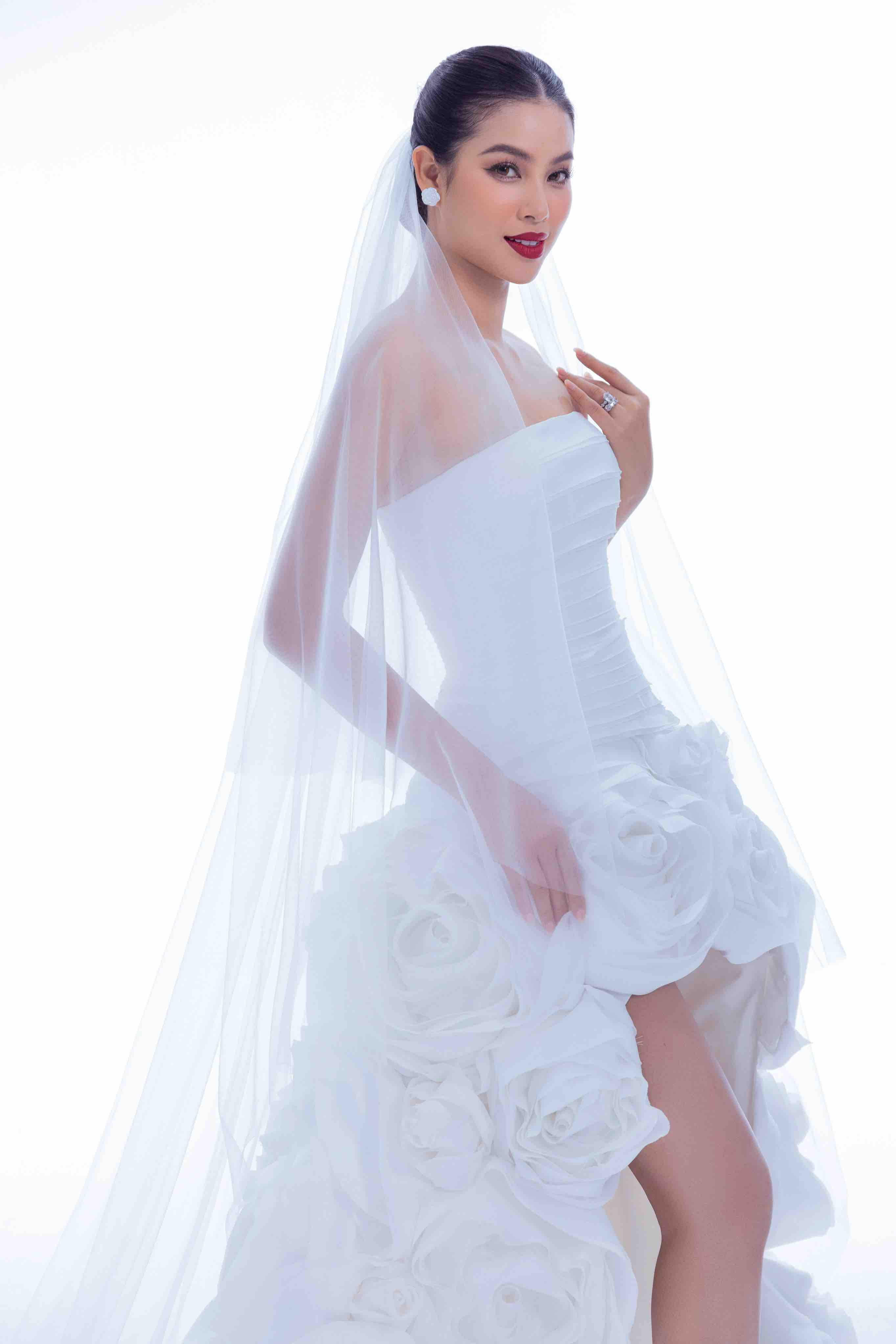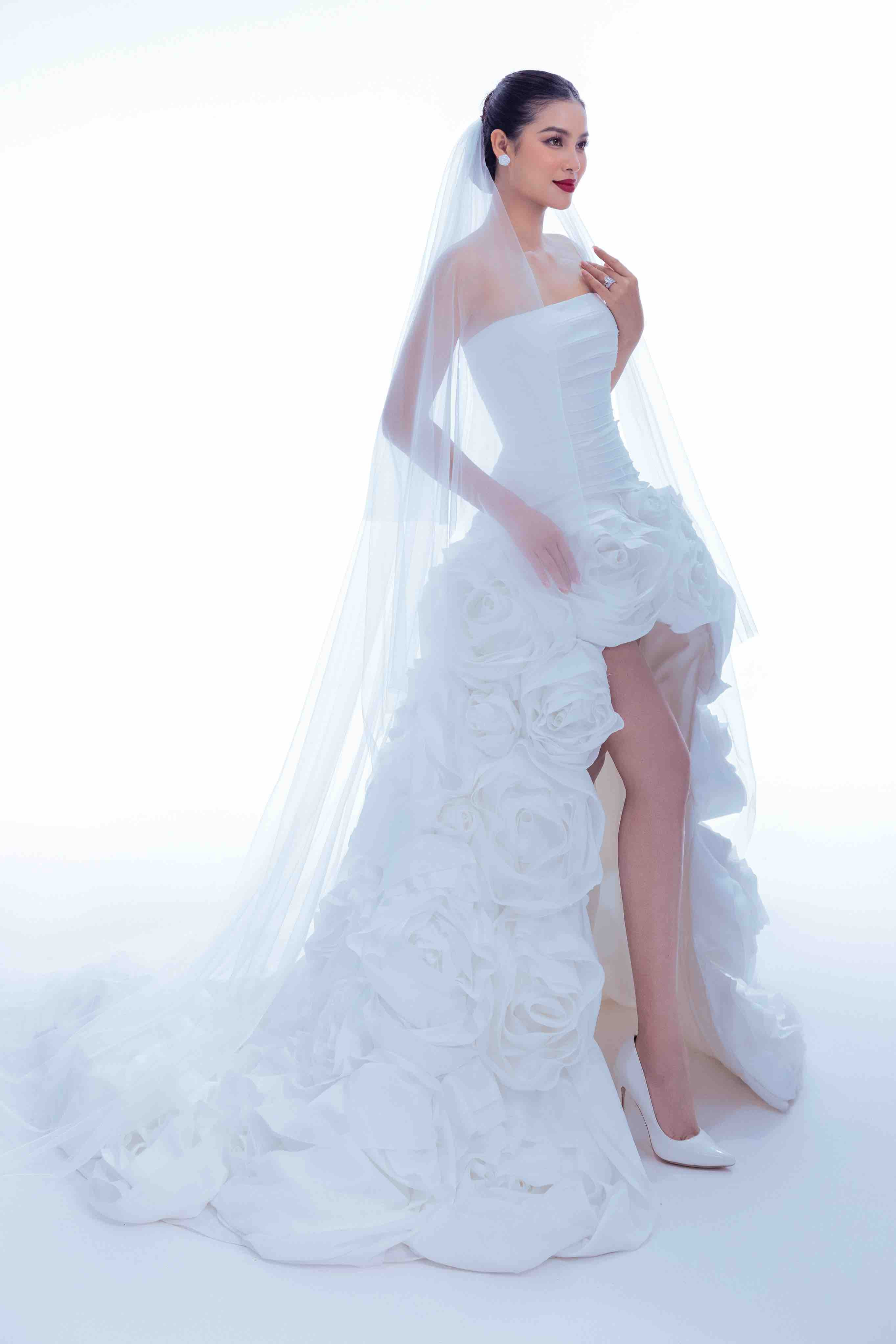 Những bộ váy cưới Phạm Hương diện được lấy cảm hứng từ trái tim và hoa hồng - hai biểu tượng của tình yêu. Điểm nhấn là mẫu váy tạo hình cánh hoa hồng, được dựng phom 3D bằng cách cắt và đặt từng mảnh vải thành hình đóa hồng nở rộ, kết hợp cùng kỹ thuật thêu nổi của các thợ thủ công lành nghề. Điều này giúp hình ảnh hoa hồng vô cùng sống động dù chỉ sử dụng duy nhất một màu chỉ trắng.