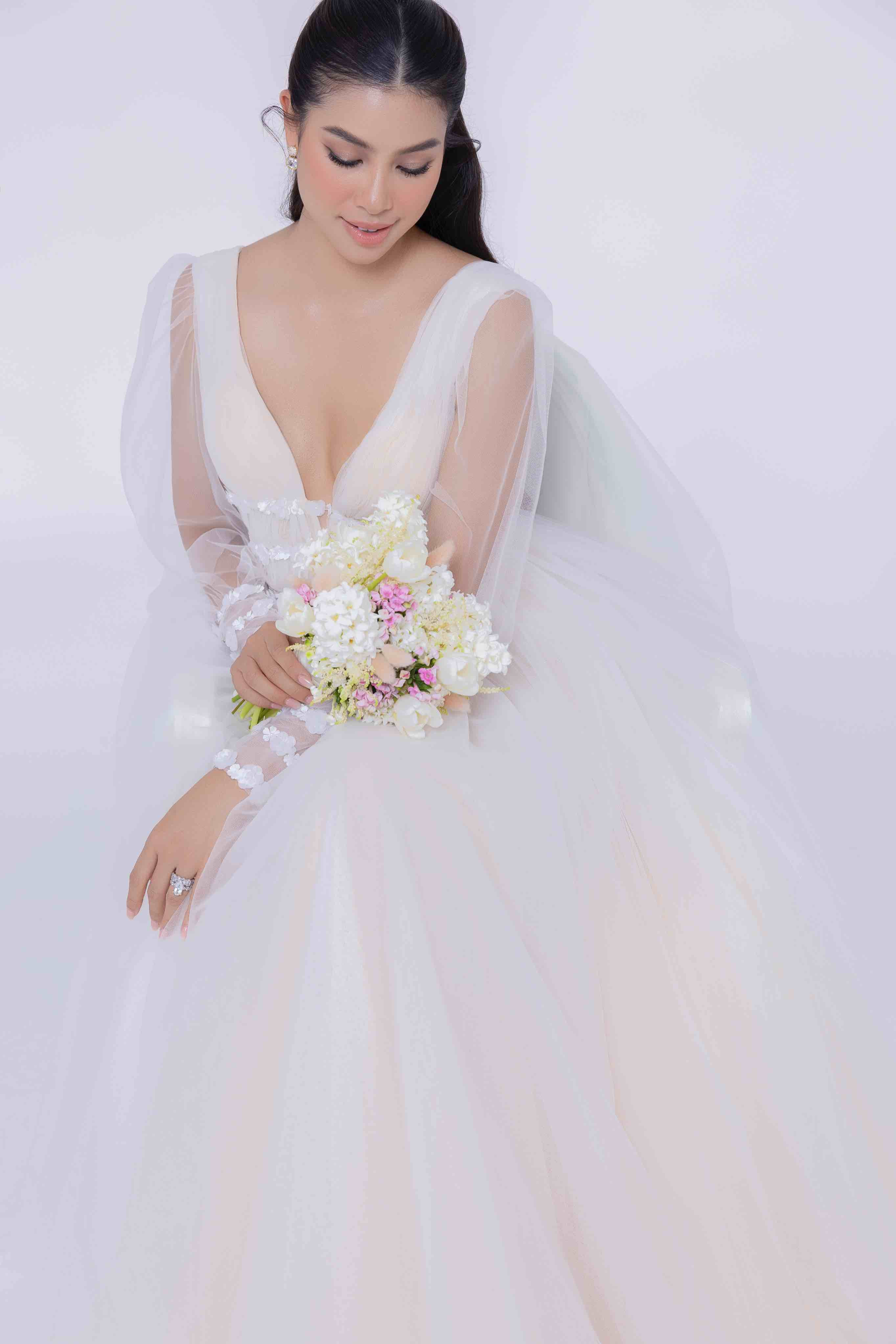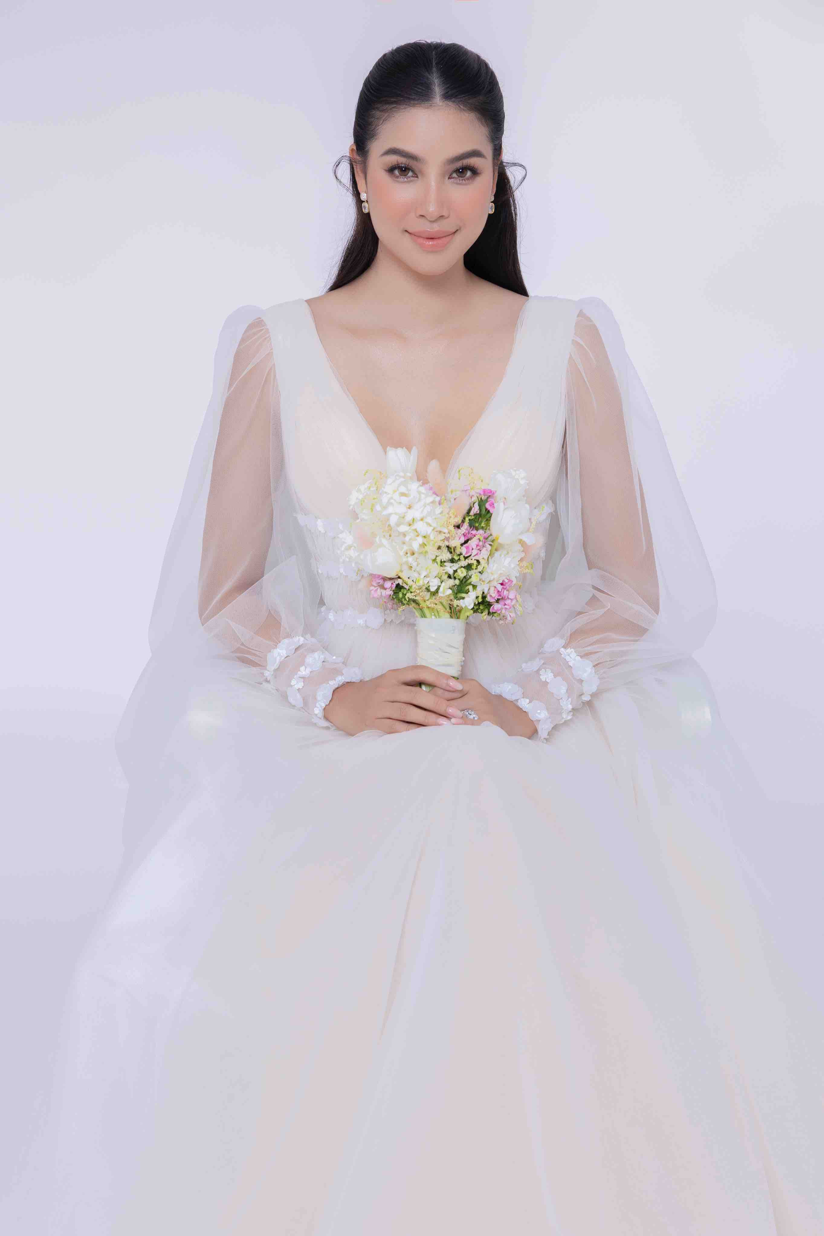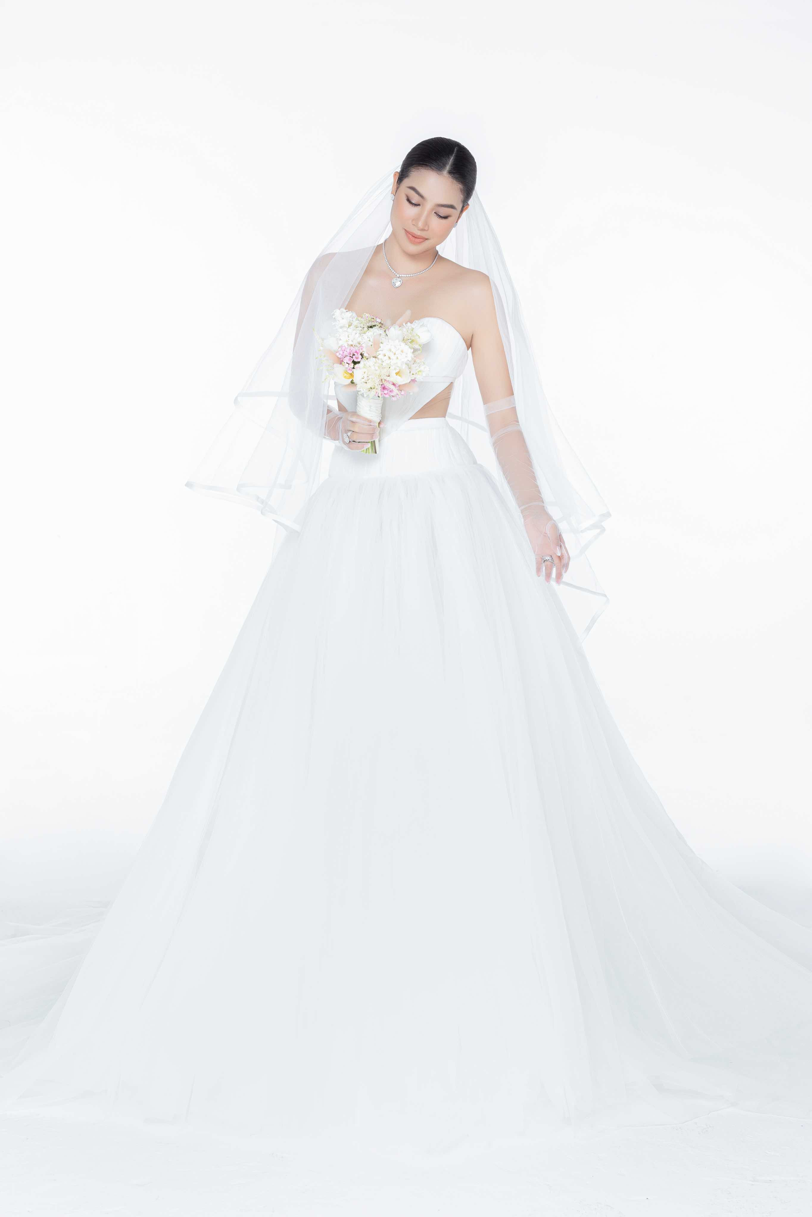 Những bộ váy cưới Phạm Hương diện được lấy cảm hứng từ trái tim và hoa hồng - hai biểu tượng của tình yêu. Điểm nhấn là mẫu váy tạo hình cánh hoa hồng, được dựng phom 3D bằng cách cắt và đặt từng mảnh vải thành hình đóa hồng nở rộ, kết hợp cùng kỹ thuật thêu nổi của các thợ thủ công lành nghề. Điều này giúp hình ảnh hoa hồng vô cùng sống động dù chỉ sử dụng duy nhất một màu chỉ trắng.