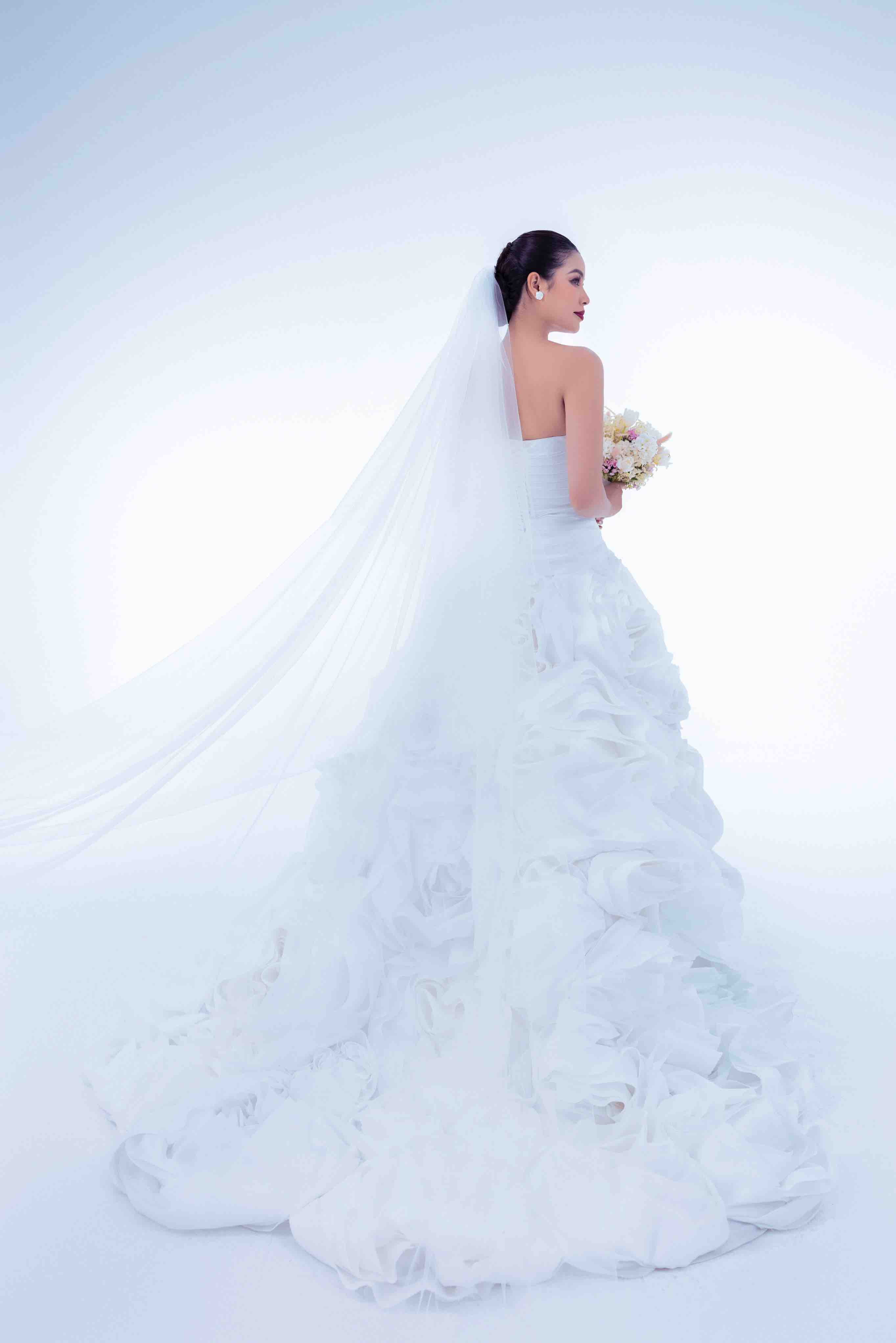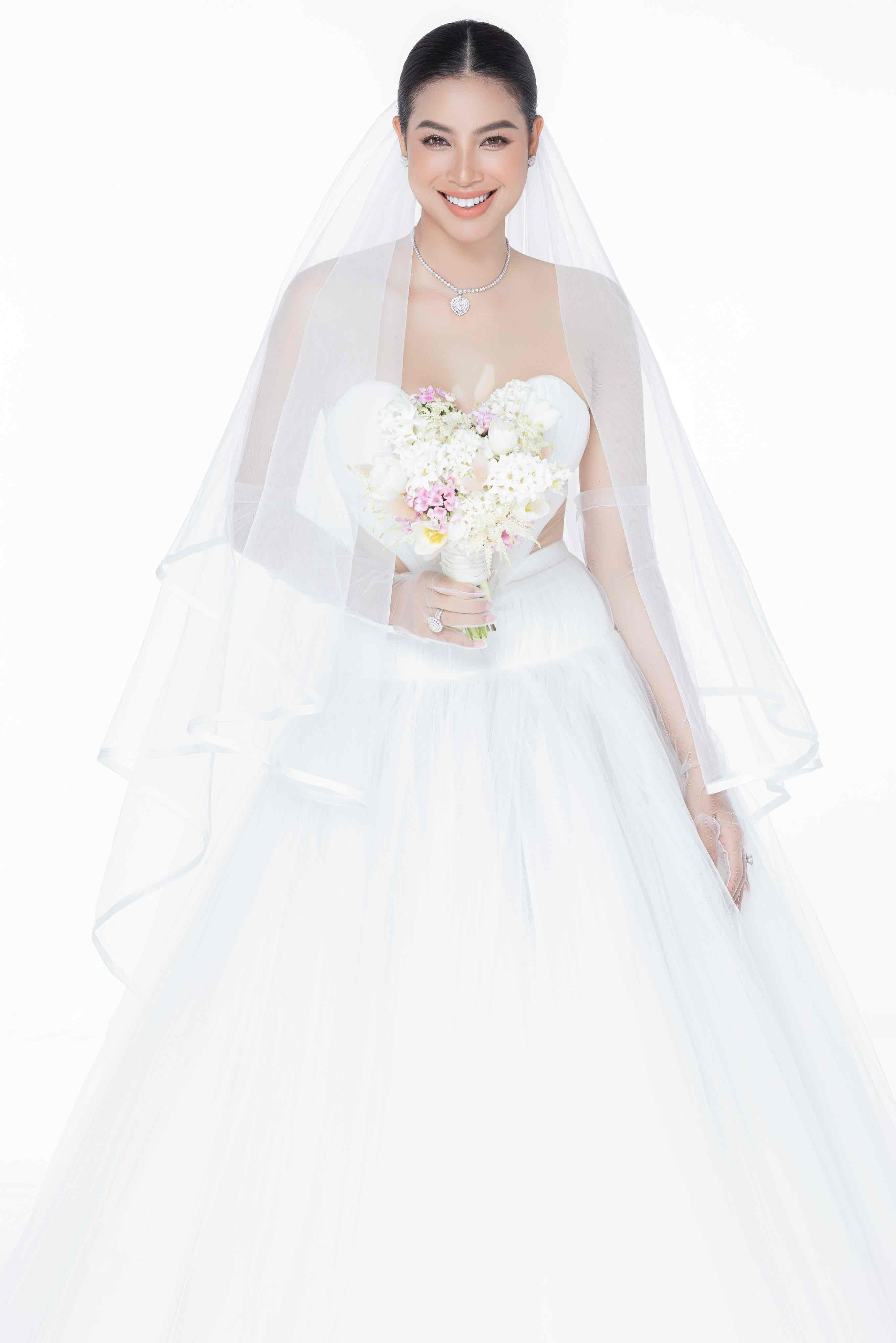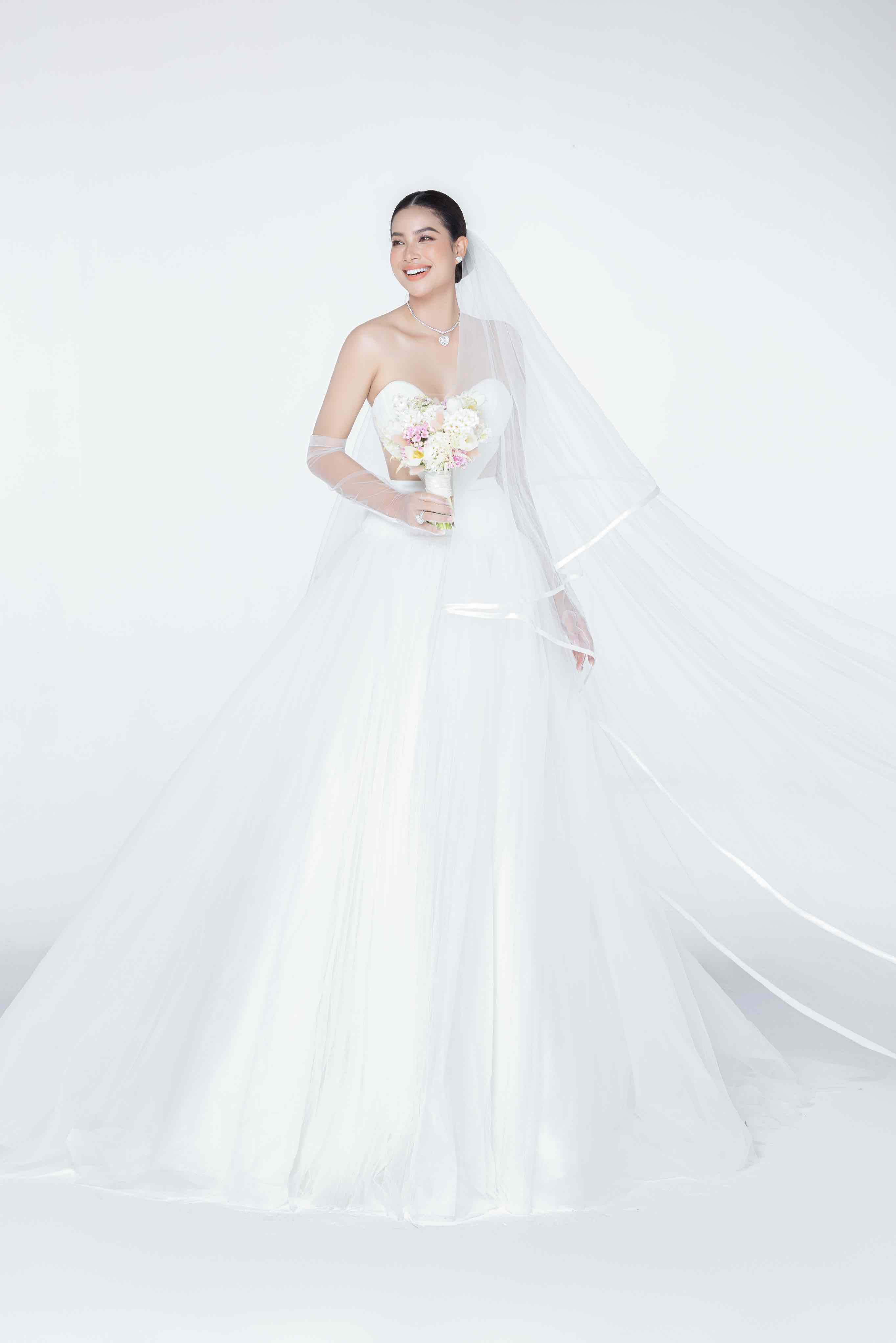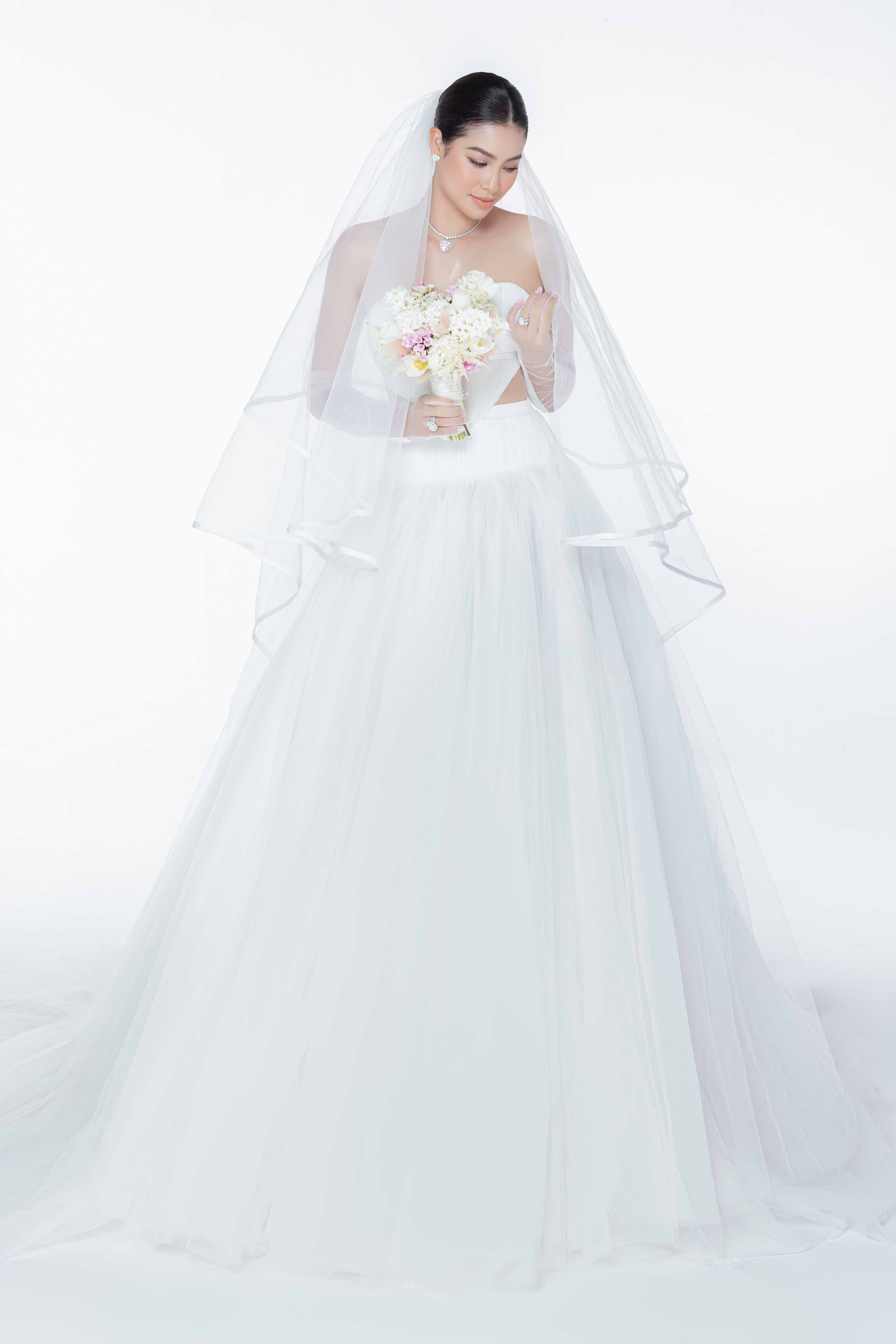 Những bộ váy cưới Phạm Hương diện được lấy cảm hứng từ trái tim và hoa hồng - hai biểu tượng của tình yêu. Điểm nhấn là mẫu váy tạo hình cánh hoa hồng, được dựng phom 3D bằng cách cắt và đặt từng mảnh vải thành hình đóa hồng nở rộ, kết hợp cùng kỹ thuật thêu nổi của các thợ thủ công lành nghề. Điều này giúp hình ảnh hoa hồng vô cùng sống động dù chỉ sử dụng duy nhất một màu chỉ trắng.