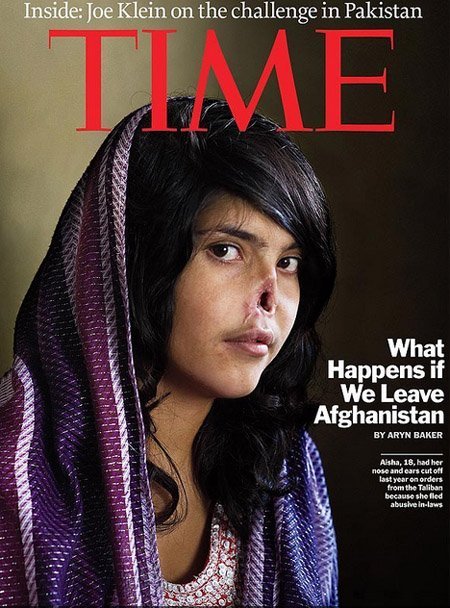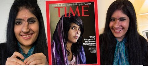Aesha Mohammadzai trên bìa tạp chí Time với khuôn mặt đã bị cắt mũi. |