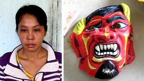 | Võ Thị Hiền và chiếc mặt nạ ác quỷ mà Hiền đã sử dụng khi đột nhập vào nhà bà Thủy (Ảnh: Công an nhân dân) |