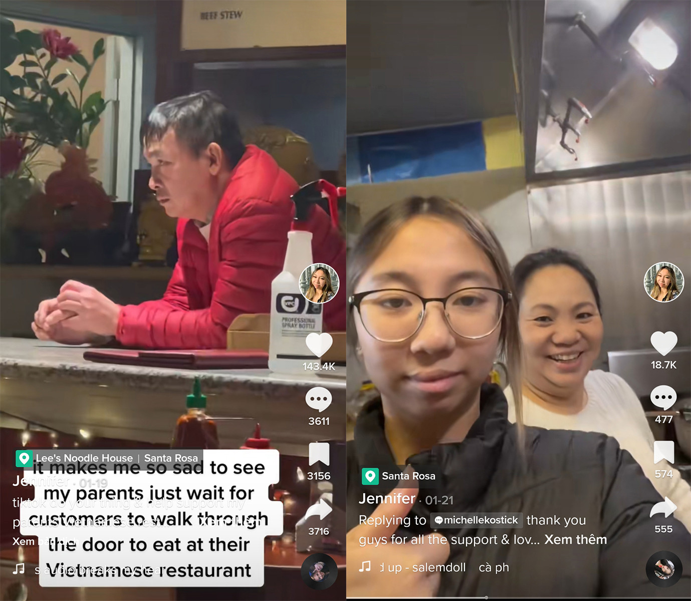 Jennifer Le chú thích vào đoạn video của mình rằng: "Tôi rất buồn khi thấy bố mẹ mình chờ khách hàng nhưng không có ai vào."