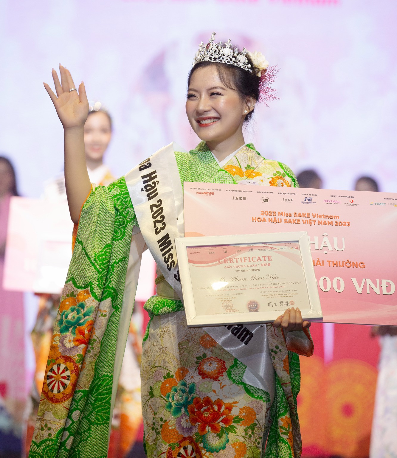 Chung kết Hoa hậu Sake Việt Nam 2023 diễn ra với phần tranh tài của 18 thí sinh. Các người đẹp đã trải qua phần trình diễn trang phục truyền thống của Việt Nam và Nhật Bản. Phạm Thiên Nga xuất sắc giành vương miện.Phạm Thiên Nga (giữa) và Á hậu 1 Hà Thị Cẩm Lệ, Á hậu 2 Lưu An Phương.Hoa hậu Phạm Thiên Nga sinh năm 1999 tại Hà Nội. Cô hiện đang là Phó giám đốc Trung tâm nghiên cứu pháp luật và công tác xã hội toàn cầu (thuộc Liên hiệp các hội Khoa học và Kỹ thuật Việt Nam). Phạm Thiên Nga đang theo học tại Đại học Quốc tế Mỹ và chuẩn bị bảo vệ luận án tiến sĩ vào tháng 7 tới. Phạm Thiên Nga cũng được trao giải phụ Người đẹp truyền thông. Sau cuộc thi, cô sẽ lên đường sang Nhật Bản giao lưu.Ban tổ chức cho biết, cuộc thi không chỉ là sự kiện nhan sắc mà còn là chương trình giao lưu văn hóa, xúc tiến thương mại...Vì vậy ban tổ chức mong muốn các cô gái tham dự phải có sự hiểu biết, chín chắn, nhiều trải nghiệm trong cuộc sống cũng như công việc. Cuộc thi là cầu nối quảng bá văn hóa hai nước Việt Nam - Nhật Bản đến bạn bè thế giới. Trong ảnh là top 5 thí sinh trong trang phục Kimono.
