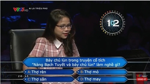 Tiếp đến, khi được hỏi: “Trong truyện cổ tích Nàng bạch tuyết và bảy chú lùn làm nghề gì?”, Hải Yến khá phân vân giữa các đáp án “A- Thợ rèn”, “B – Thợ mỏ”, “C – Thợ Săn”, “D- Thợ may”. Cô ngay lập tức hỏi ý kiến khán giả trong trường quay, nhưng tỷ lệ được đưa ra không có sự chênh lệch lớn, khiến cô buộc phải sử dụng thêm sự trợ giúp gọi điện thoại cho người thân. Sau khi người này trả lời là “Thợ mỏ”, Hải Yến mới yên tâm chốt đáp án cuối cùng, chính thức vượt qua 5 câu hỏi của chương trình.