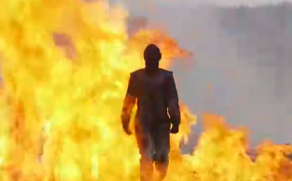 Đoạn clip ghi lại cảnh tượng phi thường nói trên cho thấy, người phụ nữ can đảm mặc một bộ đồ màu trắng, hiên ngang bước qua lửa cháy ngút trời trong khi đất nổ tung dưới chân cô.