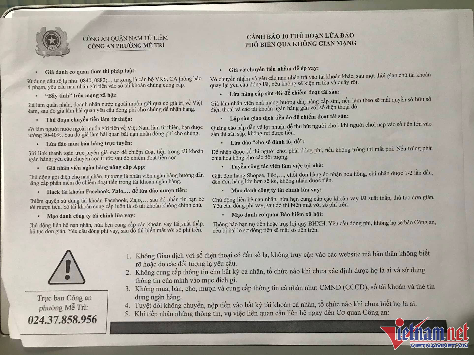 “Cơ quan công an, viện kiểm sát, tòa án không mời làm việc qua mạng, qua điện thoại. Khi cần làm việc với người dân, các cơ quan chức năng sẽ phối hợp với Công an phường chứ không tự ý liên hệ như các đối tượng trên mạng thường đe dọa” - chỉ huy Công an phường Mễ Trì nhấn mạnh.