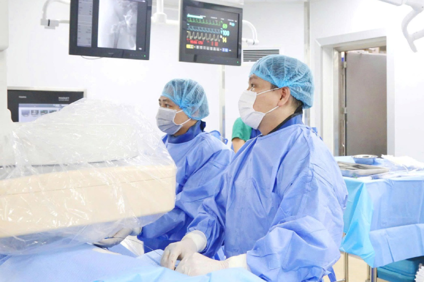 Ngay sau đó, ê-kíp đã tiến hành tháo bỏ túi vỡ, làm sạch khoang ngực và đặt túi ngực mới cho bệnh nhân.