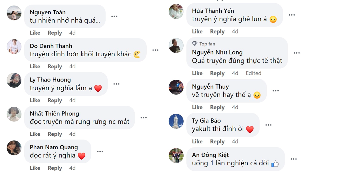 Lay động độc giả cả về nội dung và ý nghĩa, bộ truyện đã “chạm” đến cảm xúc của nhiều người khi mà bất cứ ai cũng có thể thấy có một phần của mình ở trong đó. Lần kết hợp này của Vũ Mini với nhãn hàng Yakult đã đem đến một bộ truyện tranh với thông điệp ý nghĩa: Hạnh phúc quả thật “sẽ đến từ những khoảnh khắc rất nhỏ bé nếu chúng ta biết thay đổi…”. Hãy tập những thói quen yêu thương gia đình mà đôi khi chúng ta đã quên mất phải trân trọng.