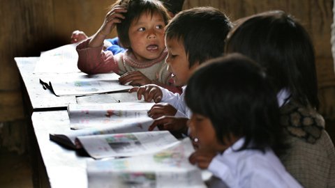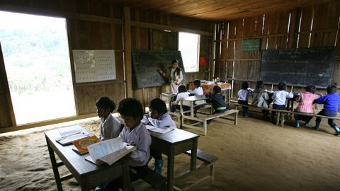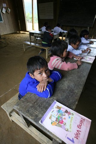 5 học sinh lớp 1, 3 học sinh lớp 2 và 3 học sinh lớp 3 hàng ngày học trong cùng một phòng học và mỗi lớp ngồi quay về phía bảng dành cho lớp mình.