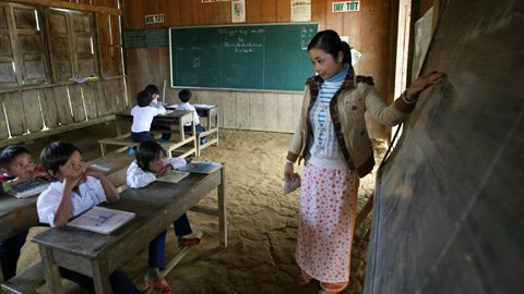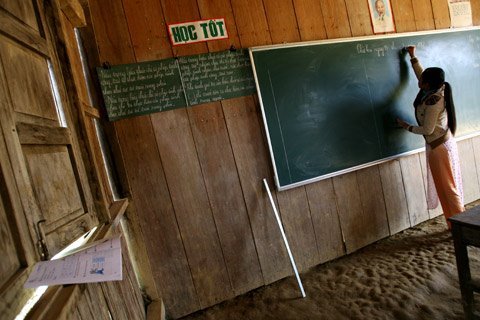 - Hàng ngày, cô giáo Nguyễn Thị Bé Thương lên lớp phải cùng lúc soạn 3 giáo án cho ba chương trình lớp 1, lớp 2 và lớp 3. Công việc này đã kéo dài hơn năm nay, vì thiếu giáo viên, học sinh đến lớp không nhiều.
