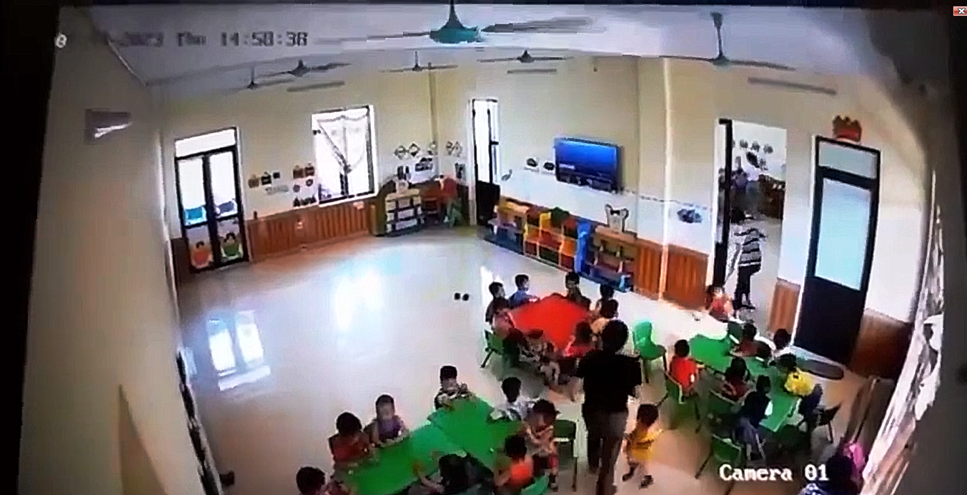 Đoạn video được ghi lại tại lớp học có nhiều trẻ mầm non đang ngồi quanh các bàn, cô giáo lấy phần đồ ăn cho trẻ ăn chiều. Lúc này, một giáo viên khác đi từ ngoài vào trong lớp để tắt tivi.