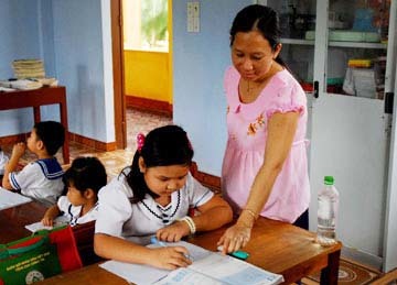 Một mình một trường với 9 trò ở đủ các độ tuổi và lớp khác nhau, có cả mẫu giáo, cô Nhung gần như dạy kèm cho các cháu và trở thành người hướng dẫn cho bố mẹ. Ở đây, mỗi gia đình một mái nhà nhưng sống bên nhau gần gũi, thân tình. Sống giữa phụ huynh, cô Nhung vừa là cô giáo, vừa là láng giềng. Có hôm nào các cháu bị phạt, cô Nhung trao đổi với phụ huynh ngay. Và có bài học nào hụ huynh chưa biết hướng dẫn con học, mang sang hỏi cô, cô lại tiếp tục hướng dẫn cho phụ huynh cách dạy con học.