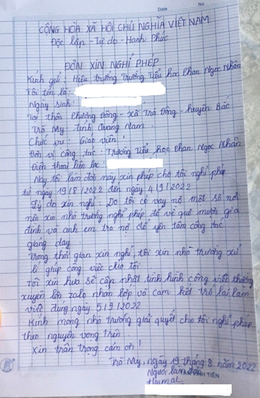 Đơn của cô M. xin nghỉ bắt đầu từ ngày 19/8 đến 4/9. Nhưng theo Hiệu trưởng Trường Tiểu học Phan Ngọc Nhân - bà Lê Thị Diệu, đến ngày 5/10, cô M. vẫn chưa đến trường. Nhà trường nhiều lần liên lạc để giải quyết công việc nhưng không được.