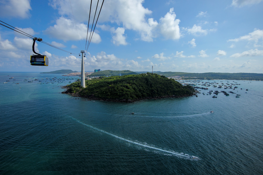 Theo tuyến cáp treo 3 dây vượt biển dài nhất thế giới hướng về Hòn Thơm, hút vào trong tầm mắt du khách là màu xanh trù phú của thảm thực vật, vùng biển xanh ngọc lam ôm ấp những bờ cát trắng mềm mại và ghềnh đá tự nhiên. Vùng biển trong vắt có thể nhìn xuyên thấu từng mảng san hô còn được điểm xuyết bởi những tàu du lịch, đánh cá nhiều màu sắc sống động.