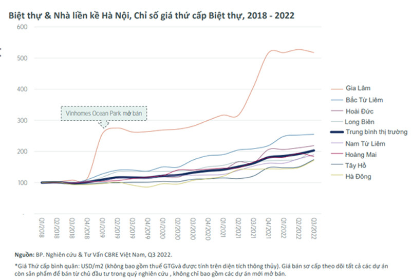 Theo báo cáo mới nhất của CBRE, thời gian gần đây, giá sơ cấp biệt thự và nhà liền kề Hà Nội đã tăng đáng kể. Riêng trong quý III/2022, mức giá bình quân toàn thị trường biệt thự, nhà liền kề Hà Nội đã tăng 36% so với cùng kỳ trong đó, giá sản phẩm biệt thự tăng 42%, giá nhà phố thương mại tăng 50%.