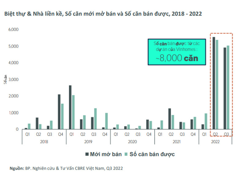 Về tính thanh khoản, lực hấp thụ của sản phẩm biệt thự và nhà liền kề Hà Nội trong quý II và III vừa qua tiếp tục được thúc đẩy mạnh mẽ nhờ sức hút của dự án Vinhomes Ocean Park 2 - The Empire. CBRE cũng đưa ra nhận định tích cực cho phân khúc biệt thự và nhà liền kề Hà Nội với việc dự báo giá thứ cấp sẽ tiếp tục tăng và số lượng mở bán sẽ giảm đi sau năm 2022.